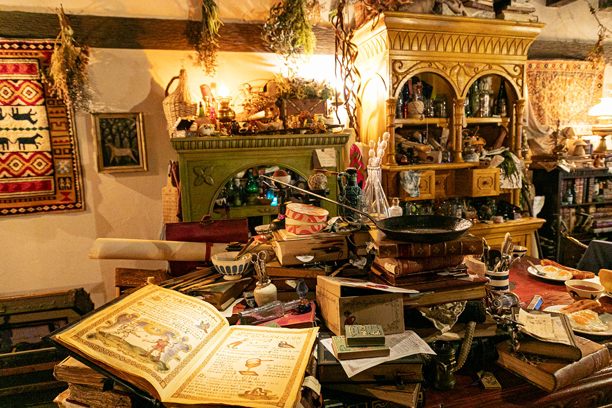そしてこちらはベラ・ヤーガの作業部屋。怪しげな雰囲気に満ち、ミステリアスな魔法の材料が隙間なく置かれています。
