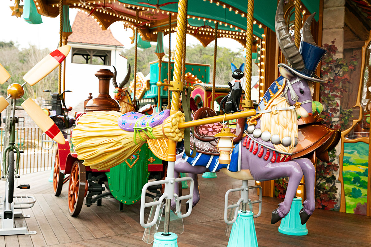 そしてこちらも大注目の「メリーゴーランド」。「年に一度、村にやってくる移動遊園地」をイメージした乗り物遊具で、『魔女の宅急便』や『ハウルの動く城』、『もののけ姫』といった作品に登場する乗り物や動物・キャラクターをモチーフに装飾されています。