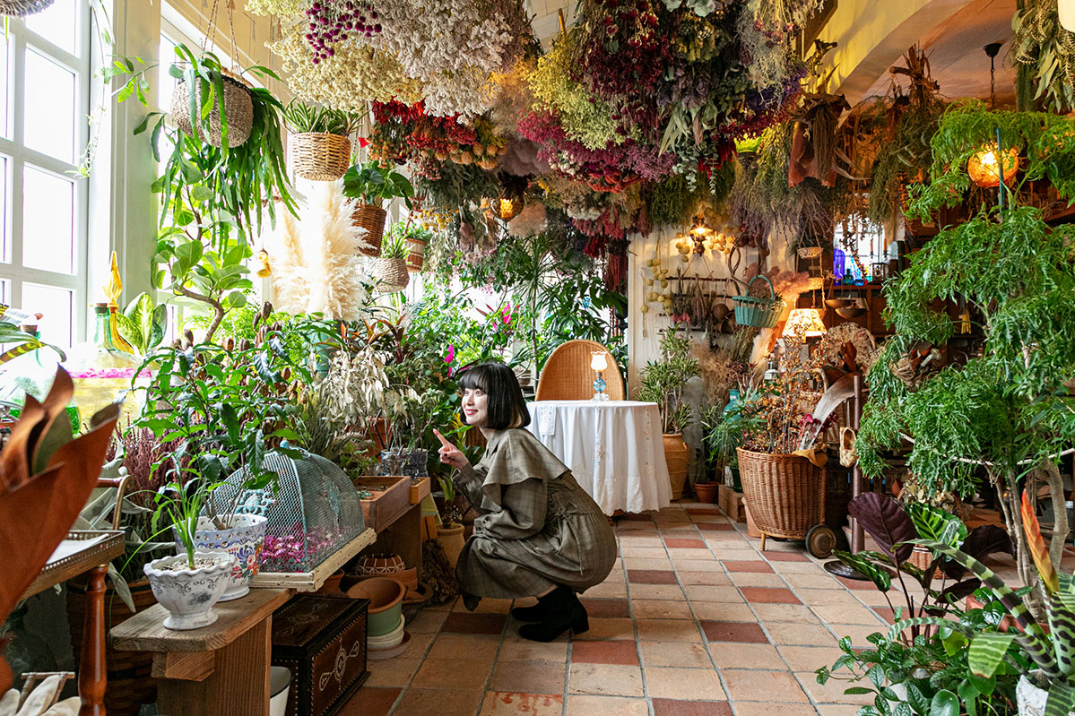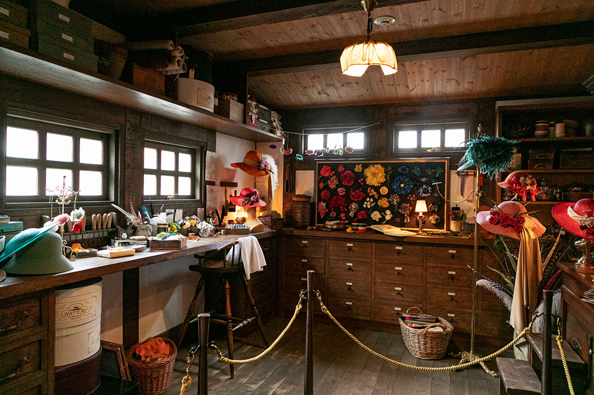 「ハッター帽子店」は『ハウルの動く城』の主人公ソフィーが切り盛りする2階建ての帽子店で、ソフィーの作業場やショップがあります。1階のショップではオリジナルのキャンディー缶や帽子を販売し、中庭から2階に上がると魔女や魔法にまつわる書籍が揃う本屋さん「魔女の本棚」がありますよ。
