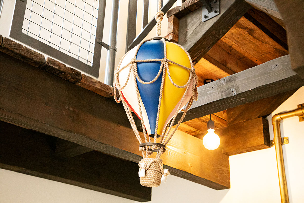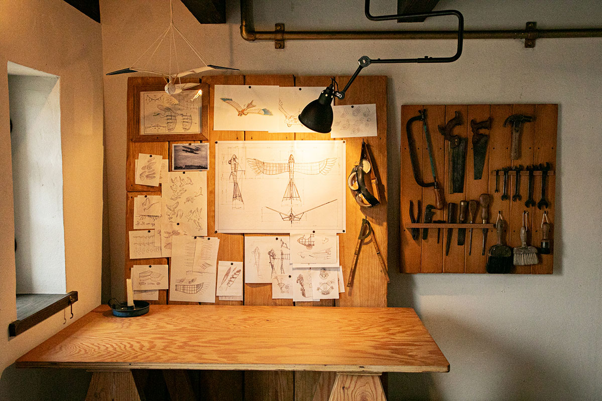 天井を見上げるとオーニソプター(羽ばたき式飛行機)が浮かんでおり、1階から2階へは遊戯施設のように上がることができます。