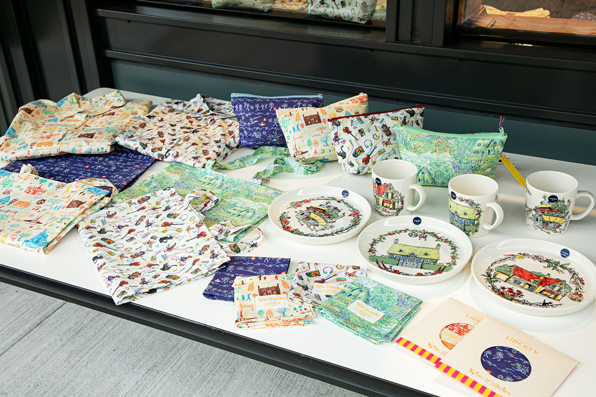 トートバッグ、シャツ、ポーチ、ハンカチは、『魔女の宅急便』、『ハウルの動く城』、『アーヤと魔女』の3作品と魔女の谷をイメージしたデザインで、イギリスのブランド「LIBERTY」との共同開発商品。プレートとマグは、「魔女の谷」にある3作品の建物をモチーフにしたデザインで、フィンランドの陶磁器ブランド「ARABIA」との共同開発商品。