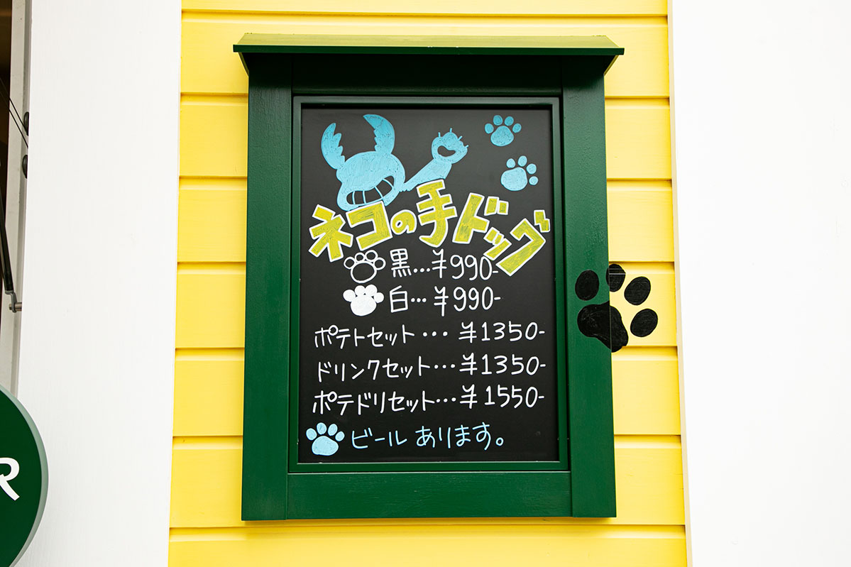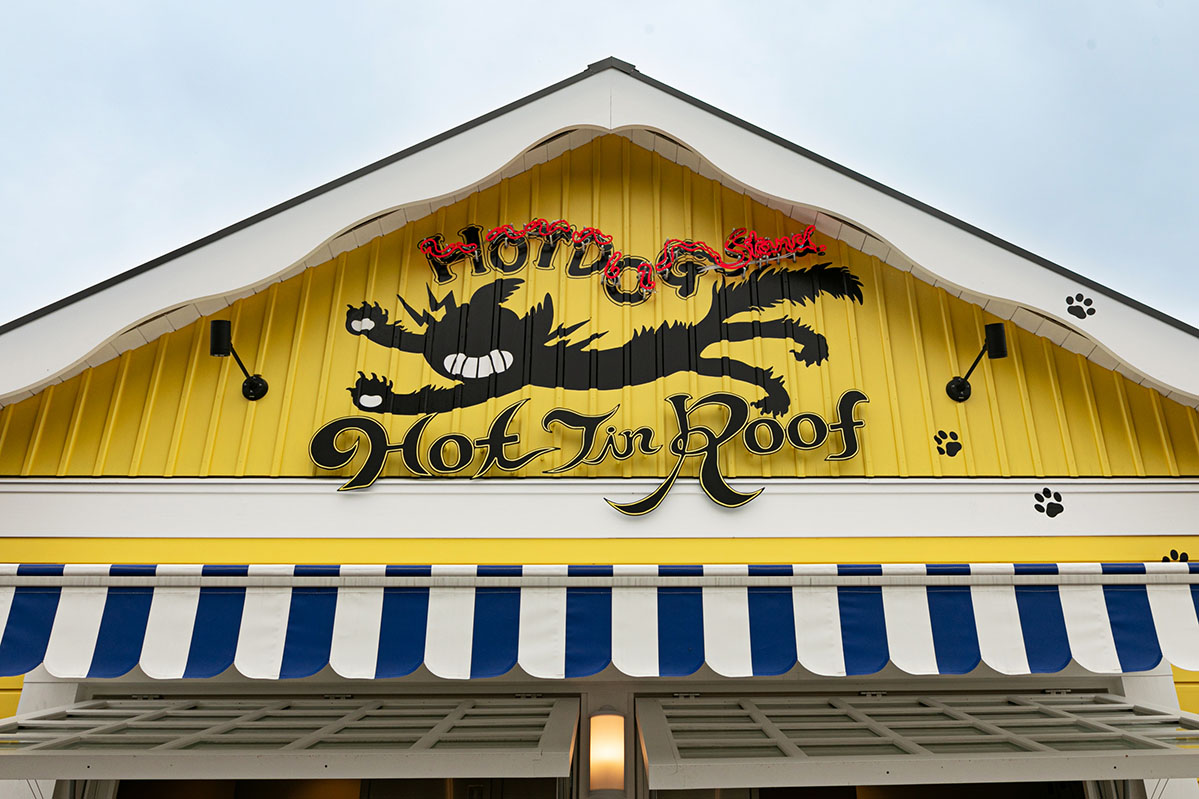 グッズの次はグルメをご紹介。1つ目は「ホットドッグスタンド ホット・ティン・ルーフ」。黄色の外観にネオンが光り、ネコがドタバタと飛び跳ねる看板のテイクアウト専門店になっています。