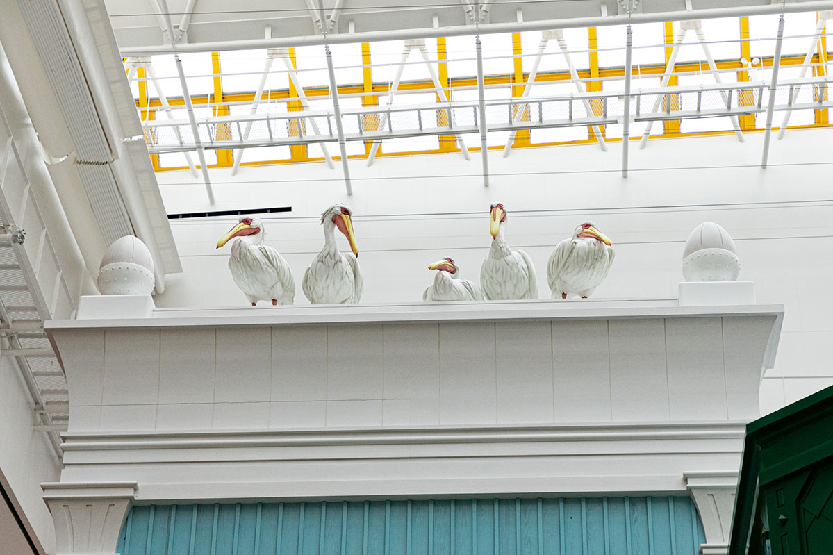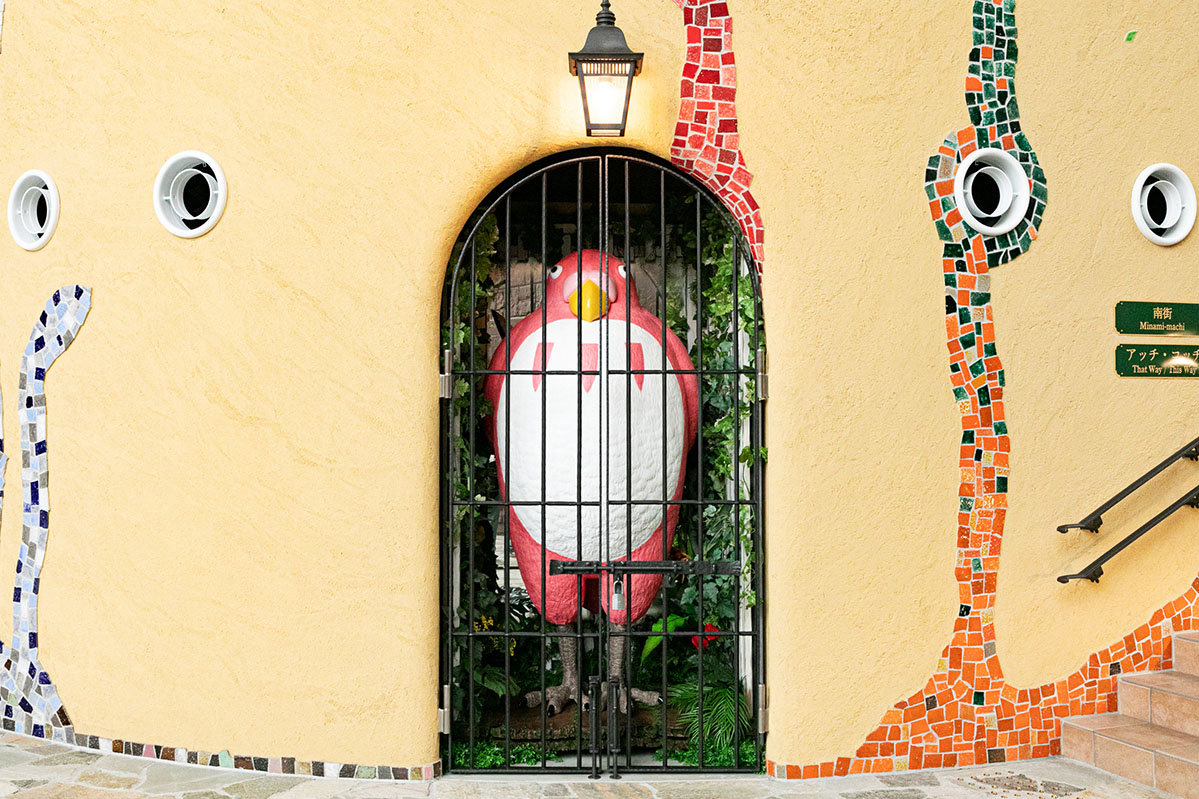 青サギ、ペリカン、インコマン(『君たちはどう生きるか』)です。中央展示室の屋根には青サギがとまっており、近くの屋根にはペリカンが。さらに中央階段の右手には料理しているインコマンの様子を見ることができます。