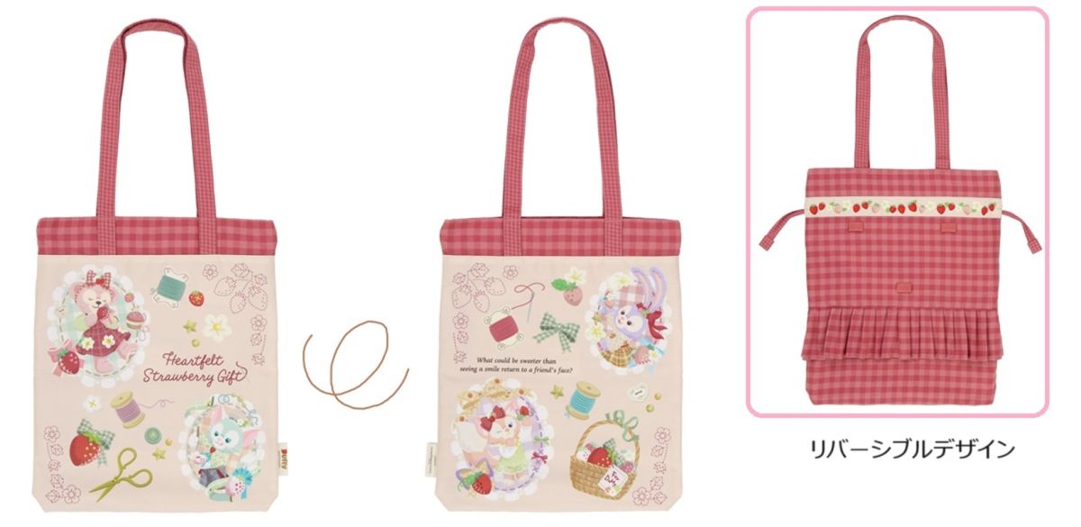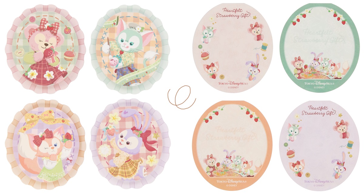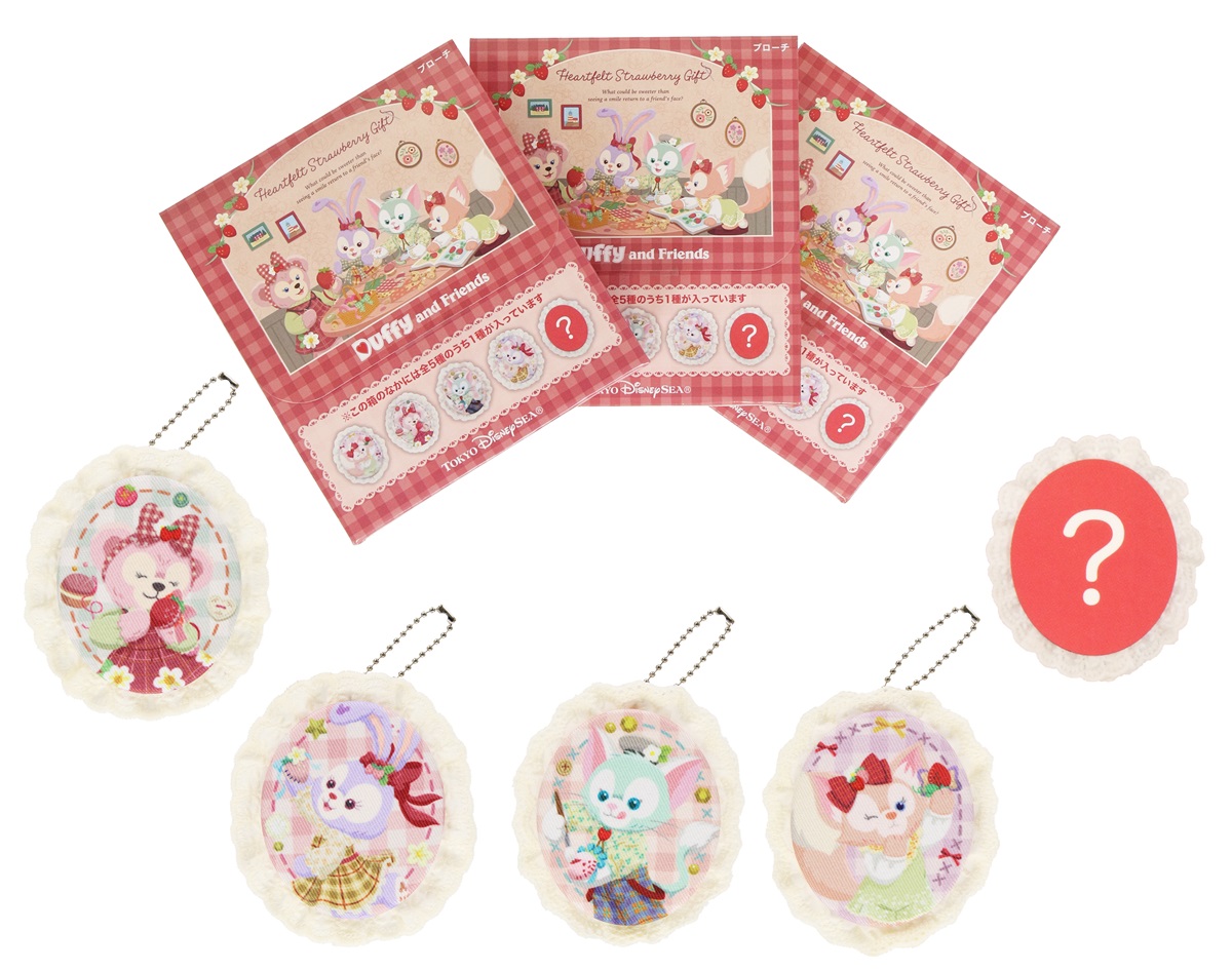 「ダッフィー&フレンズのハートフェルト・ストロベリーギフト」のストーリーをイメージしたグッズとして、ダッフィーにプレゼントするイチゴのブローチにシェリーメイがリボンを結んでいる様子を表現した「クッション」や、みんなが作ってくれたイチゴのブローチをもらってよろこんでいるダッフィーの「ぬいぐるみ」が登場。