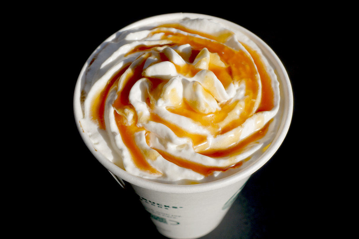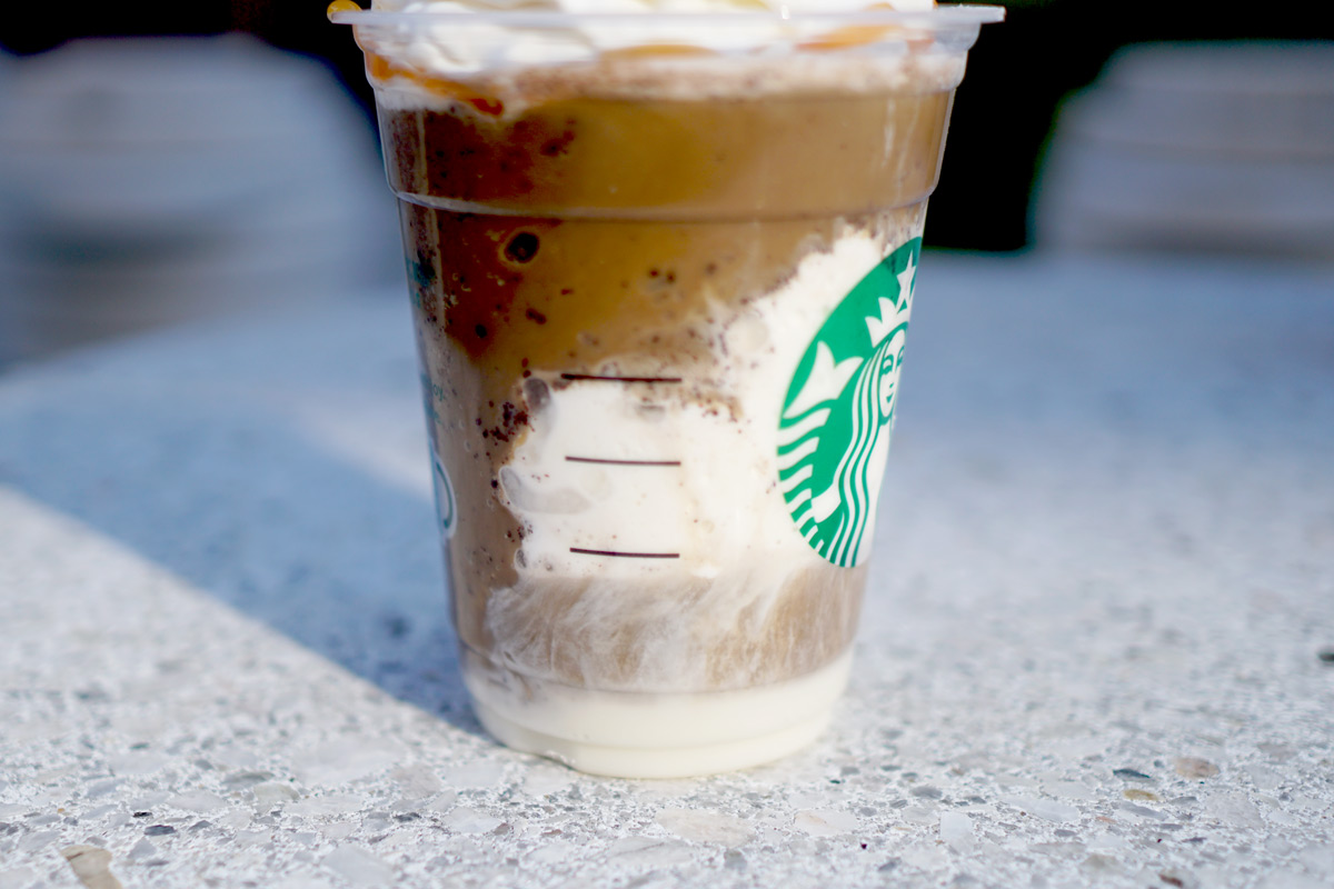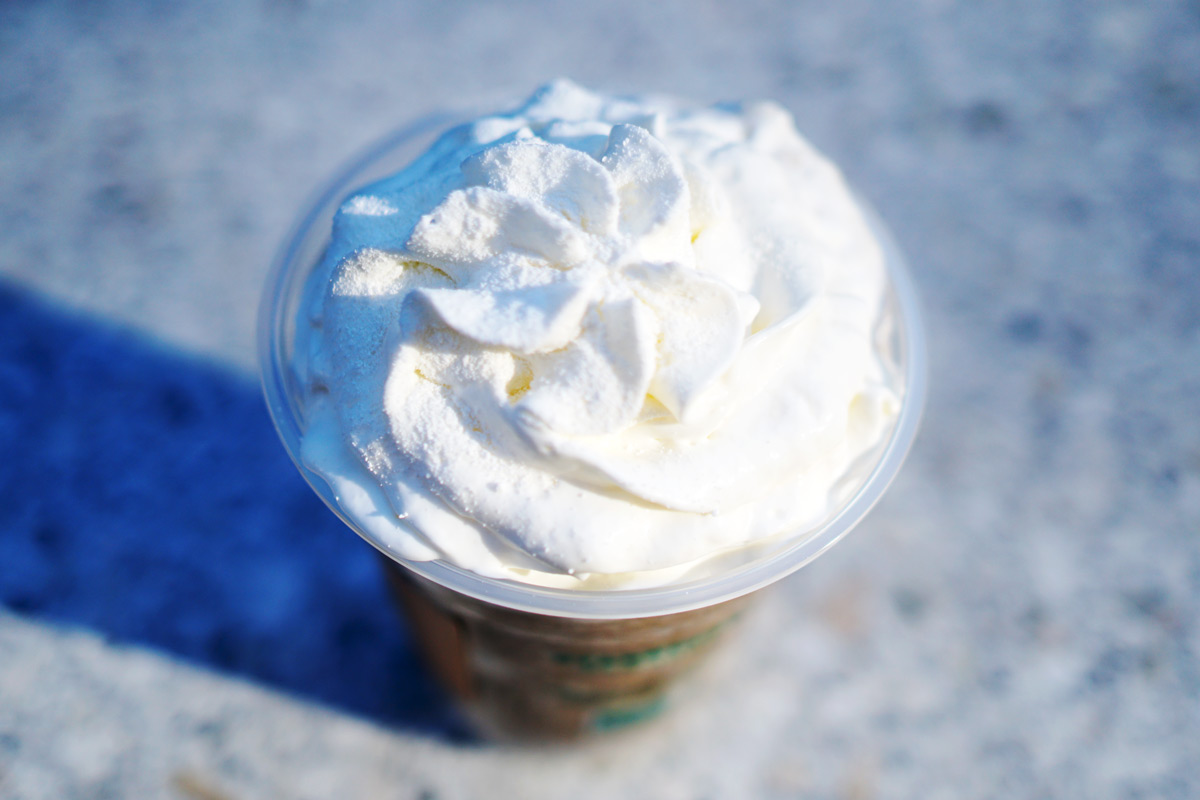 またトッピングと、カップ内にホイップクリームを多め(無料)にするのも、このフラペチーノならではのお楽しみ。よりクリーミーな味わいになるうえに、濃い茶色と白のコントラストがかわいい!