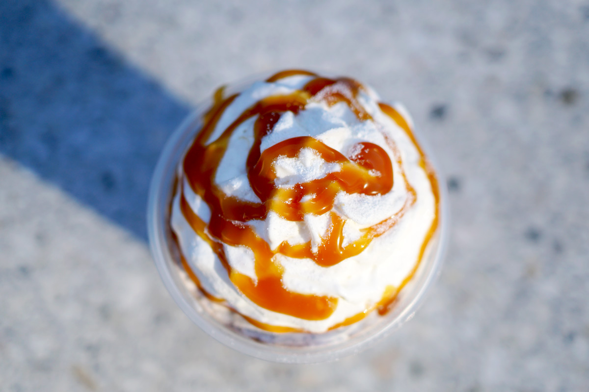 トッピングには、ホイップクリームとビターキャラメルソースが回しかけてあります。ほうじ茶×キャラメルは相性抜群!ビターキャラメルソースは、これだけ食べてもおいしいほど。コク深くさらりとした甘さで、ほうじ茶の味わいを引き立ててくれます。