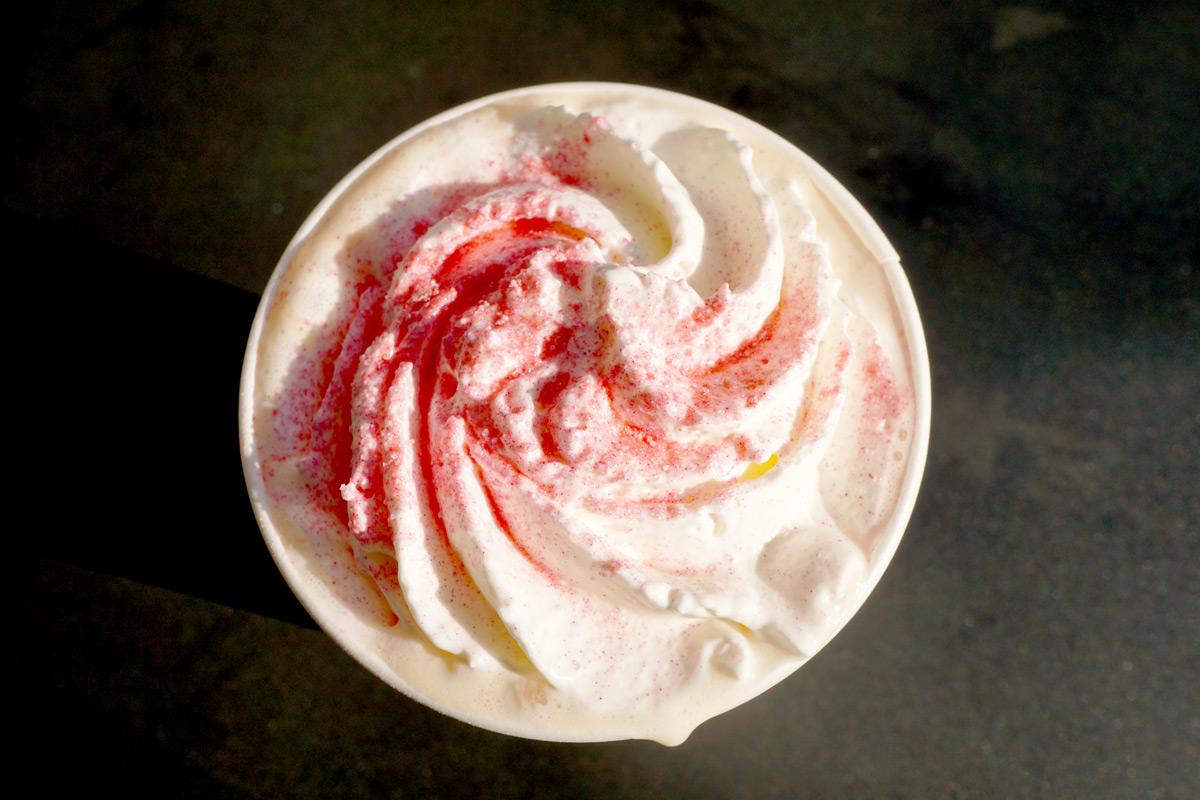 トッピングには、ホイップクリームとはちみつ、ストロベリーフレーバーパウダーが。ほんのりピンク色の新年らしいビジュアルになっています。
