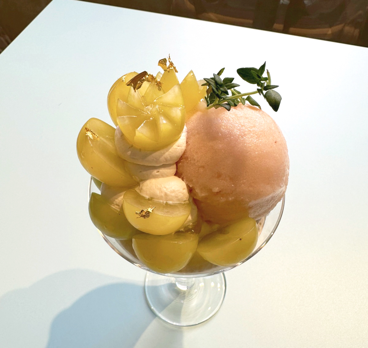 フレッシュなシャインマスカットに合わせるのは、ミルクアイス、白桃風味のペスカローザアイス、豆乳クリーム、ノンアルコールの白ワインゼリー。