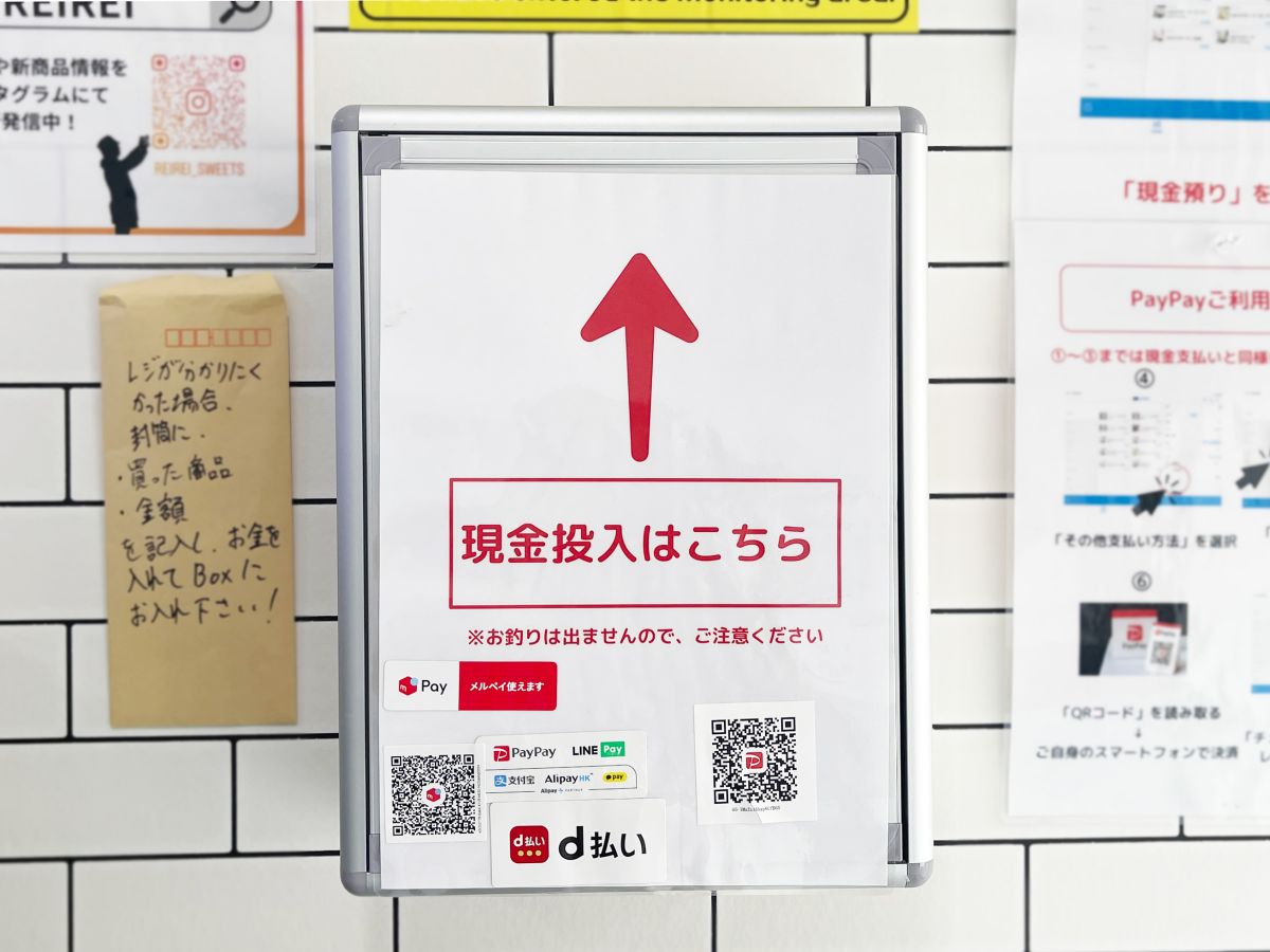 支払い方法は現金または、二次元コード決済の2種類。店内設置のタブレットで購入商品を選択し、合計金額を確認して決済します。現金はポストへ投入する方式で、おつりが出ないので注意してくださいね。