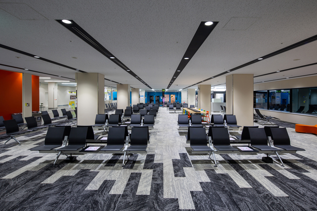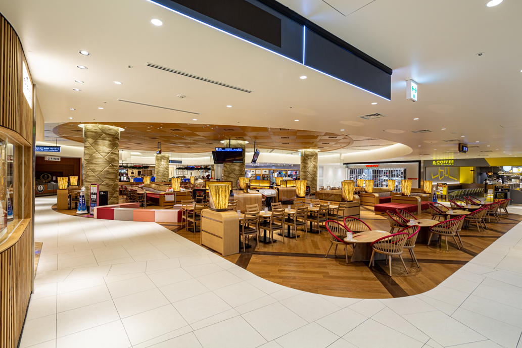 セキュリティチェック後に入場できるゲートエリア(搭乗待合エリア)にも、出発ぎりぎりまで大阪グルメや名物みやげショッピングが楽しめるスペースが充実。ウォークスルー型の商業ゾーンで、飲食店はフードコートスタイル。ショッピングモールにいるようなカジュアルな雰囲気で、とてもリラックスできます。また、北・南ターミナルは連絡通路でつながっていて往来も可能です。