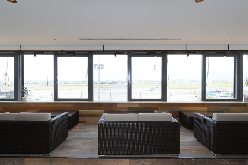 展望デッキには「よしもとエンタメショップ」、インテリアショップの「ACTUS」、「NORTH SHORE CAFE&DINING」などのほか、ショップやカフェもあり、ゆっくりと過ごすことができます。「NORTH SHORE CAFE&DINING」の滑走路側を向いたソファ席は、眺望抜群で展望デッキイチの特等席!