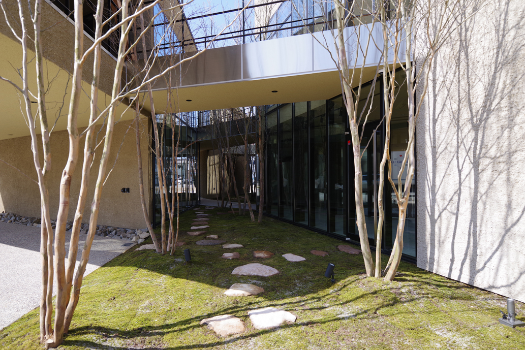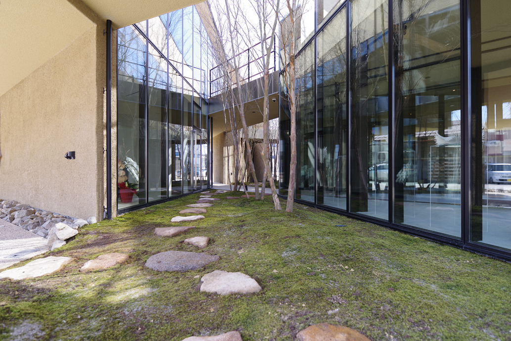 内部には飛び石がある中庭も設置されています。誰でも入ることができて、通り抜けてもOKという自由な空間造りも魅力です。「NODO」とは結節点を意味する言葉で、人と人、街と人を繋げたいという思いが込められています。