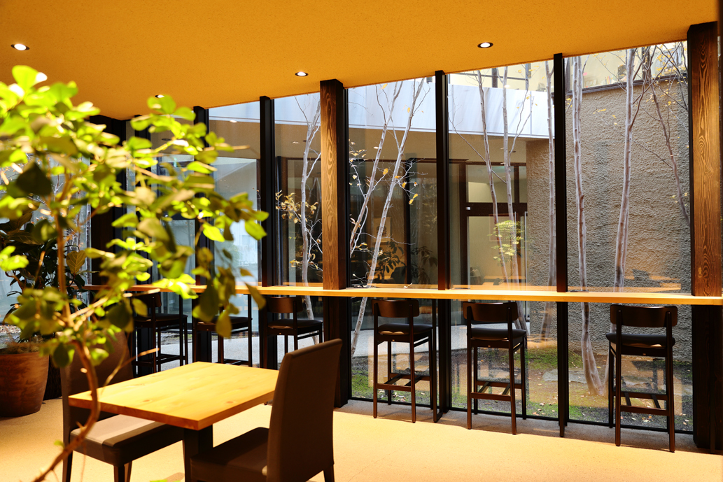 「Cafe&Restaurant Node」は天井までガラス窓に囲まれた、明るく開放的なスペースにあります。中庭に面した窓際のカウンター、ゆったりしたテーブル席で、ゆっくりとパフェやフードを味わうことができます。