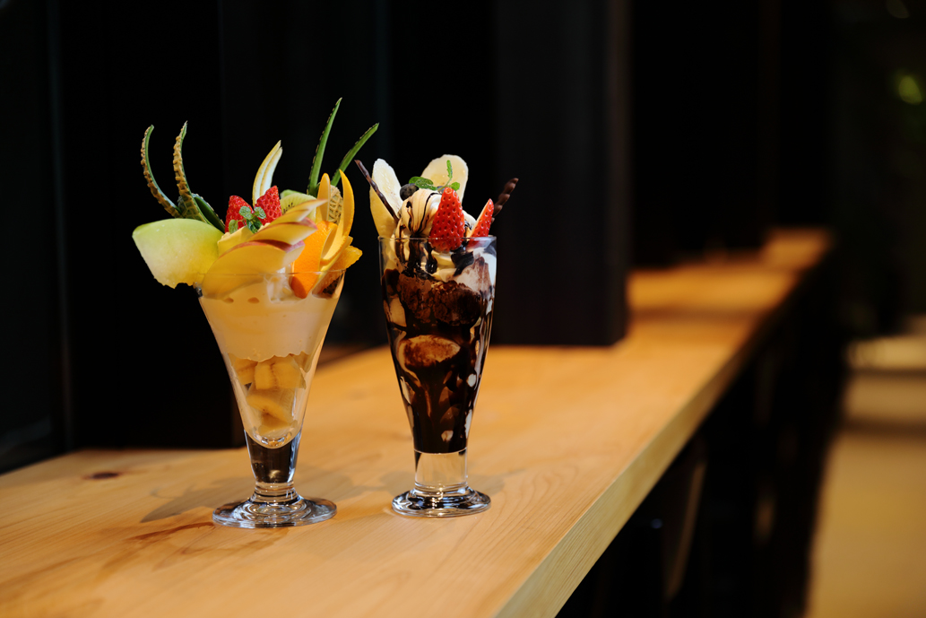 メニューのイチオシはやはり、「フルーツむらはた」で人気のパフェの数々です。フルーツのセレクトはもちろん、美しいカットやフルーツそのものが主役になるような甘味の組み合わせで、さまざまなフレーバーや食感が堪能できる逸品揃いです。