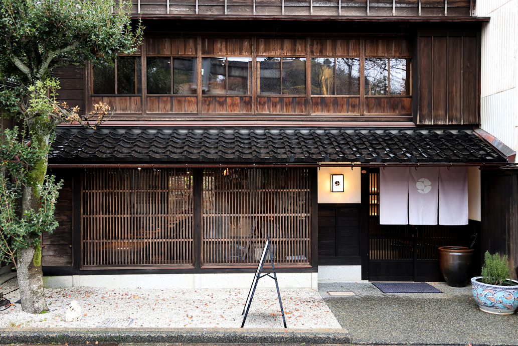 「Cafe たもん」があるのは、ひがし茶屋街の中心地から少し東のはずれ。宇多須神社の真向いにたたずむ町家の店舗です。建物は築100年以上の2階建て。町家の意匠や風情を残した風格ある店構えです。