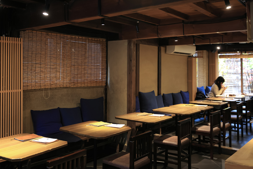 1階はテーブルが配され、モダンな雰囲気も。白檀の香りが気持ちを落ち着かせてくれます。