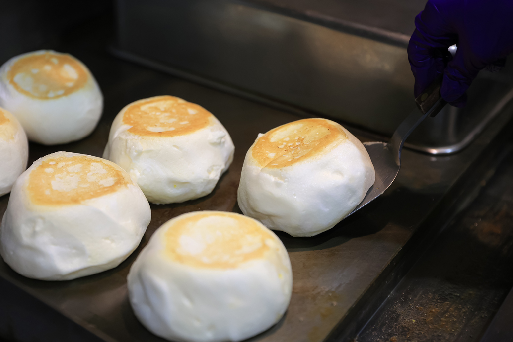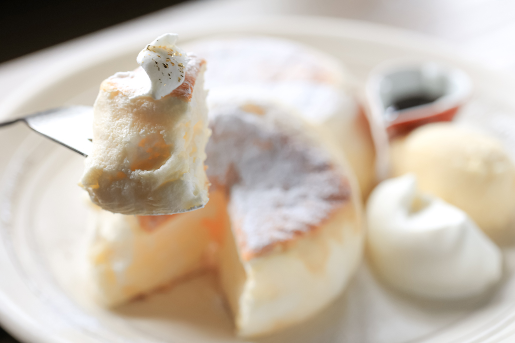 パンケーキは、注文を受けてからメレンゲを立て鉄板で蒸しながら焼いていきます。真っ白な生地でふわりとふくらんだパンケーキは、コロンとしたかわいさも魅力です。