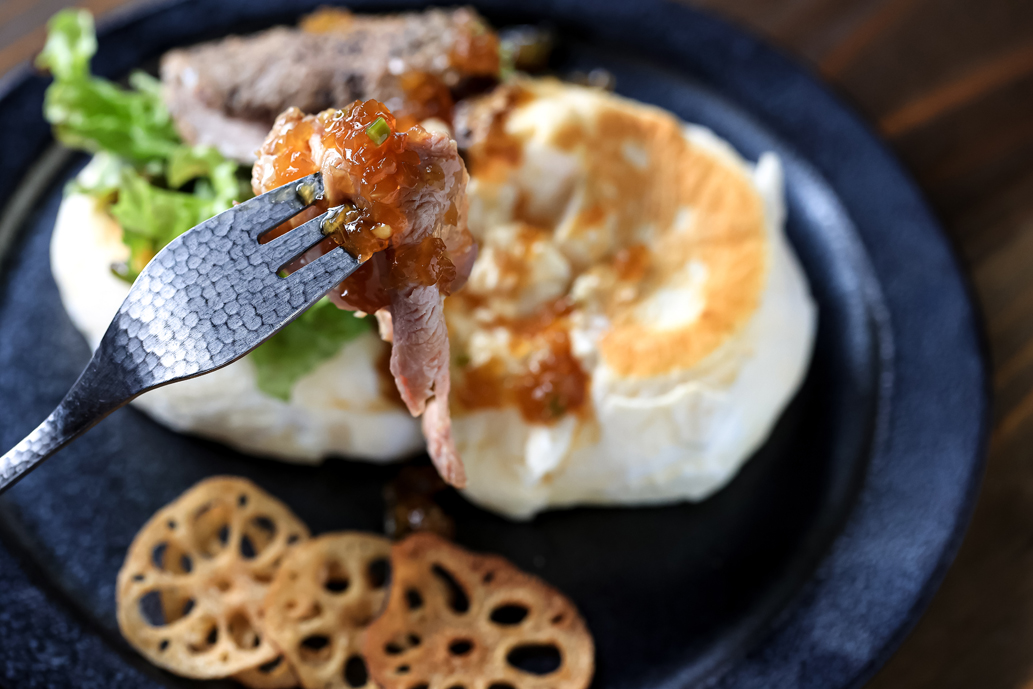 豚そのもののうま味と脂の甘さが感じられるローストポークと、和わさびを使った自家製ソースがマッチ。しっかりとした肉感とソースの甘辛さが、たもんのパンケーキのやさしい食感や甘さとも相性抜群で贅沢な味わい。