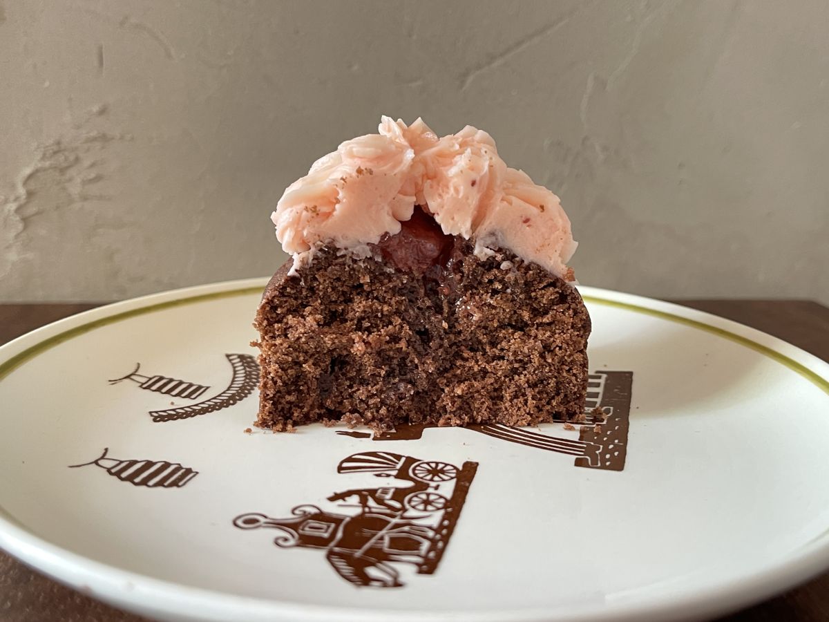 ずっしりとした食感のチョコ味のパウンドケーキの上に、なめらかないちごのバタークリームがたっぷり絞ってあります。濃厚なチョコレートといちごのバタークリームの甘さが絶妙にマッチしていておいしい!