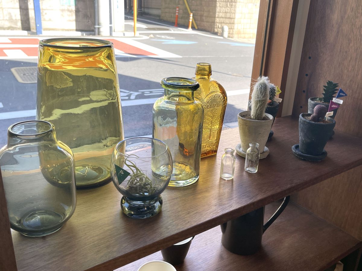 花の下には花瓶や食器など、おしゃれなヴィンテージ雑貨がずらり。