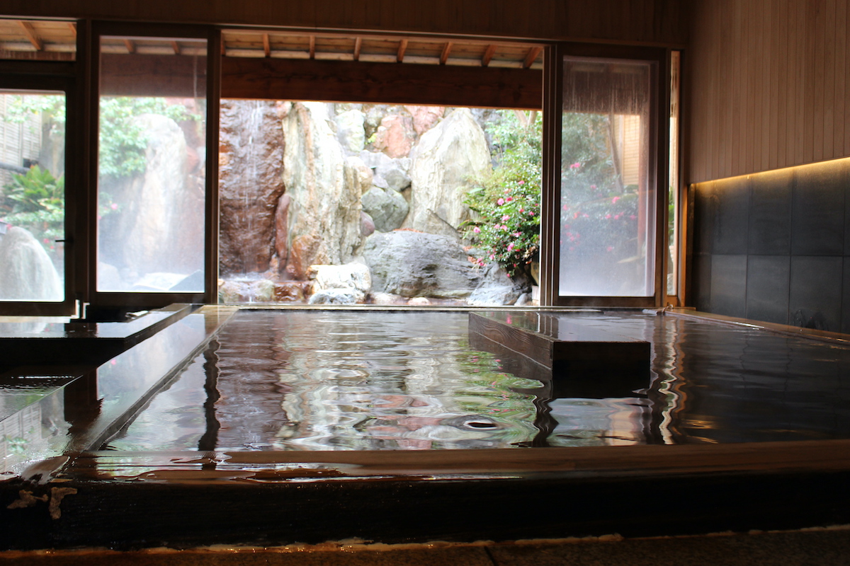 本旅館のメインでもある1階の大浴場。毎分600ℓの豊富な湯量ですが、水を加えることなく適温になるよう、温度の違う4つの源泉を常にブレンドし続けており、いつでも100%の源泉を楽しめます。