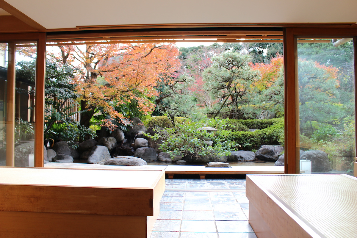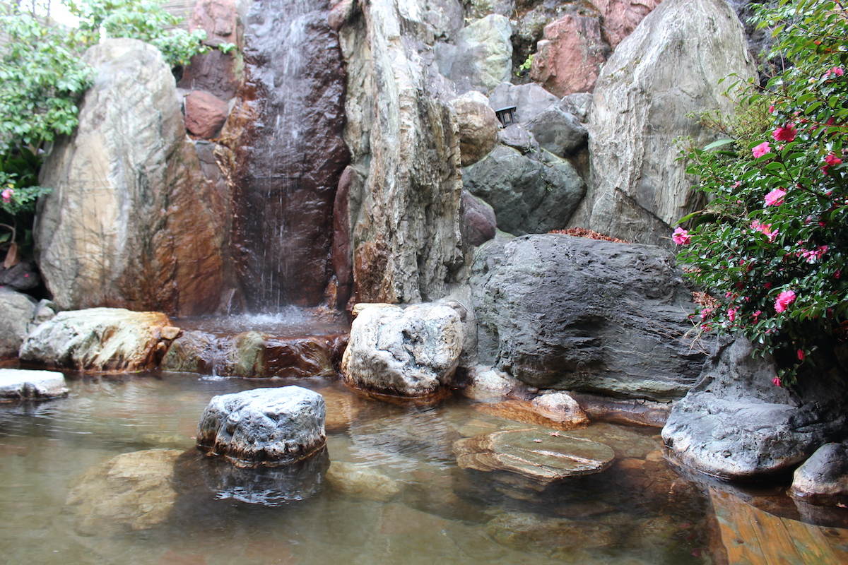 露天風呂で印象的なのが、目の前の温泉の滝。1912年創業の老舗旅館「いづみ荘」を引き継ぐ形でできた「界 伊東」ですが、この温泉の滝は当時から変わらずあるものだそう。2018年にリニューアルオープンした新しい旅館でありながら、居心地のいい温かい風情があるのは、老舗旅館の面影が残っているからなんですね。