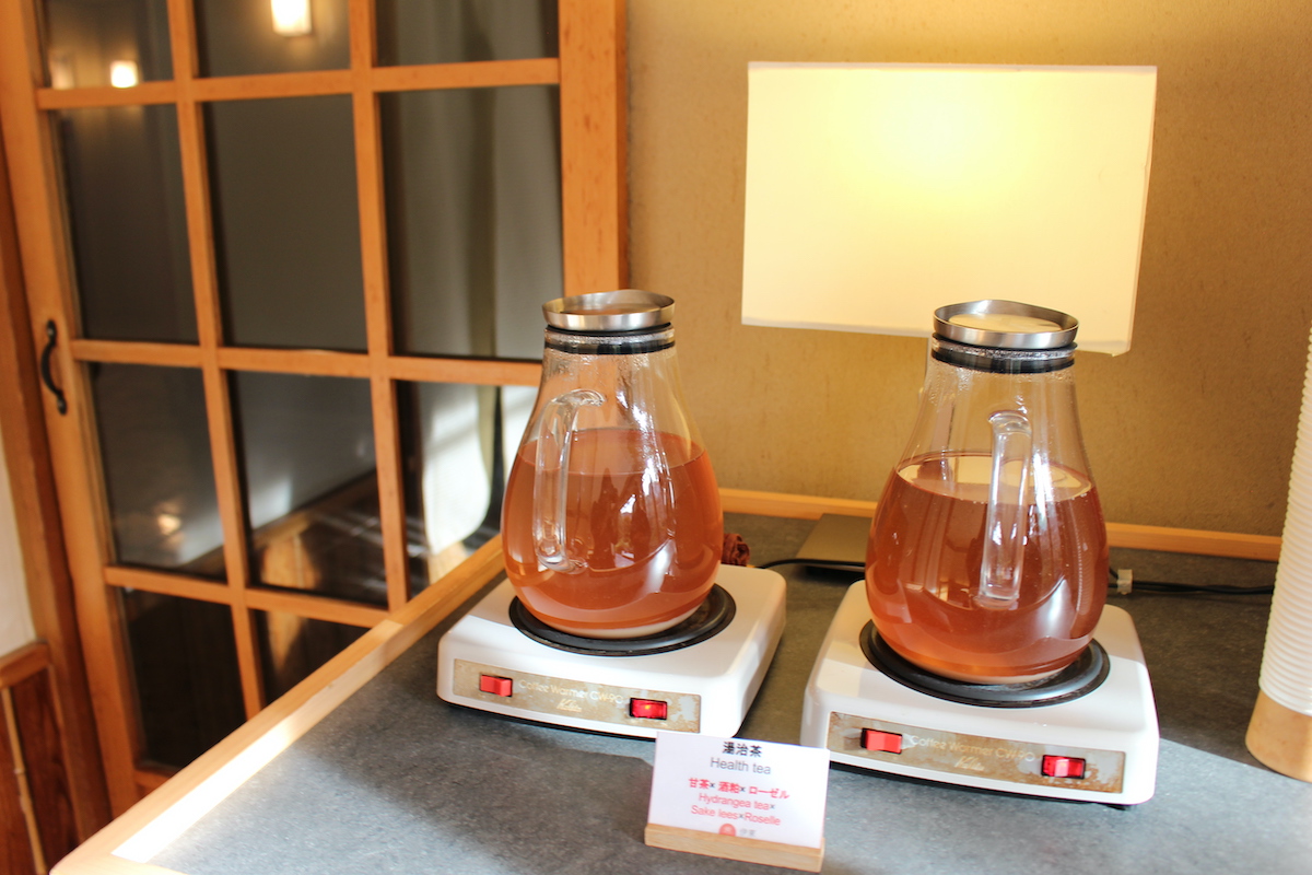 お風呂上りには湯上り処へ。待ち合わせにももちろん便利ですが、季節によって変わる湯治茶とレモンジュース、さらにはアイスキャンディーが好きなだけいただけます。まさに至れり尽くせり。目の前は足湯と庭園になっていますよ。