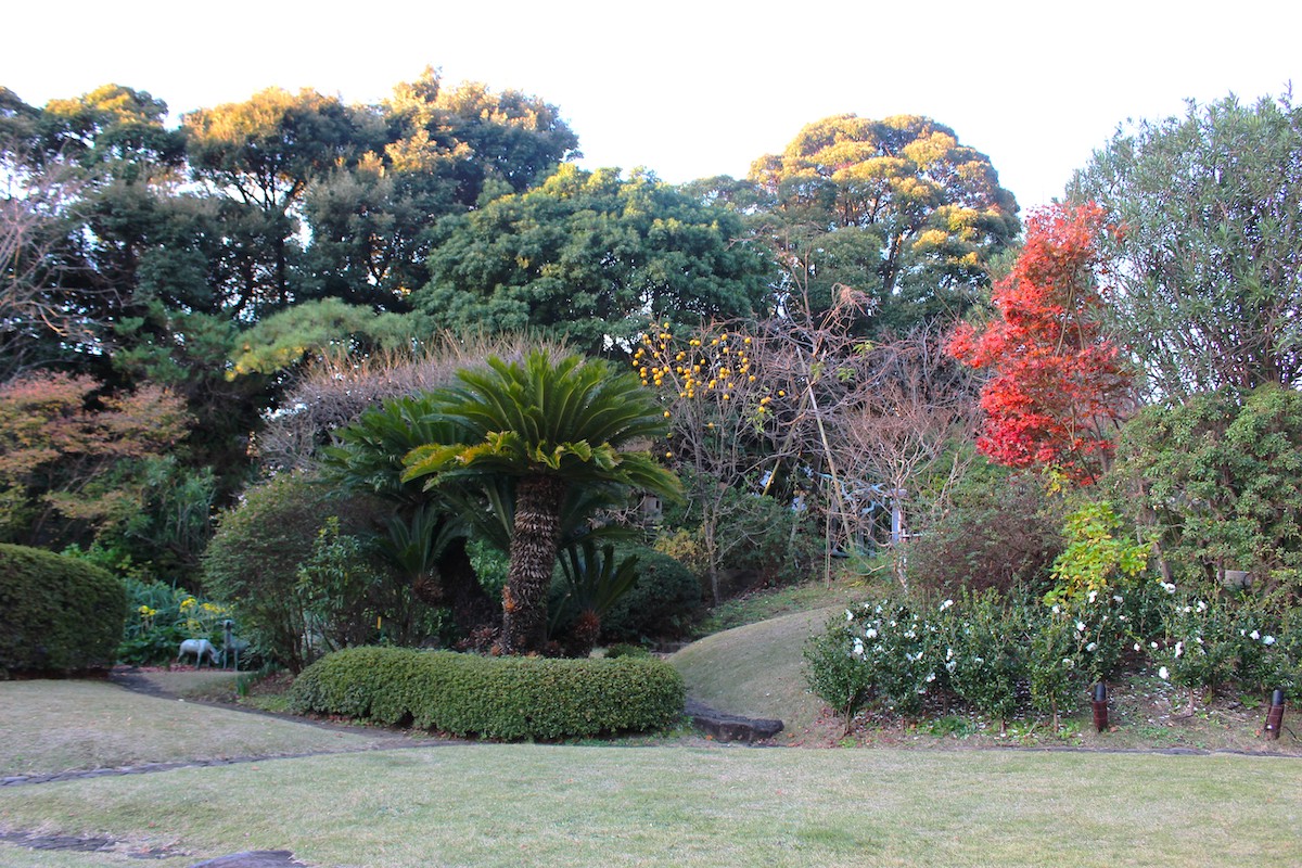 自由に出歩ける日本庭園では、一年を通してさまざまな花が咲いていて、12月の取材時は白いサザンカが咲いていました。奥に進むと、立派なコイが泳いでいる池もあります。