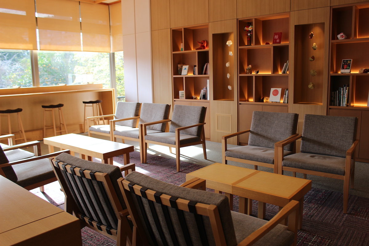 ロビーとトラベルライブラリーが一体になった広々とした空間。なんとも上品でほぐれる香りがします。館内の数カ所で、「白檀(びゃくだん)」というお香が炊かれているんです。気に入ったらショップでも購入できます。
