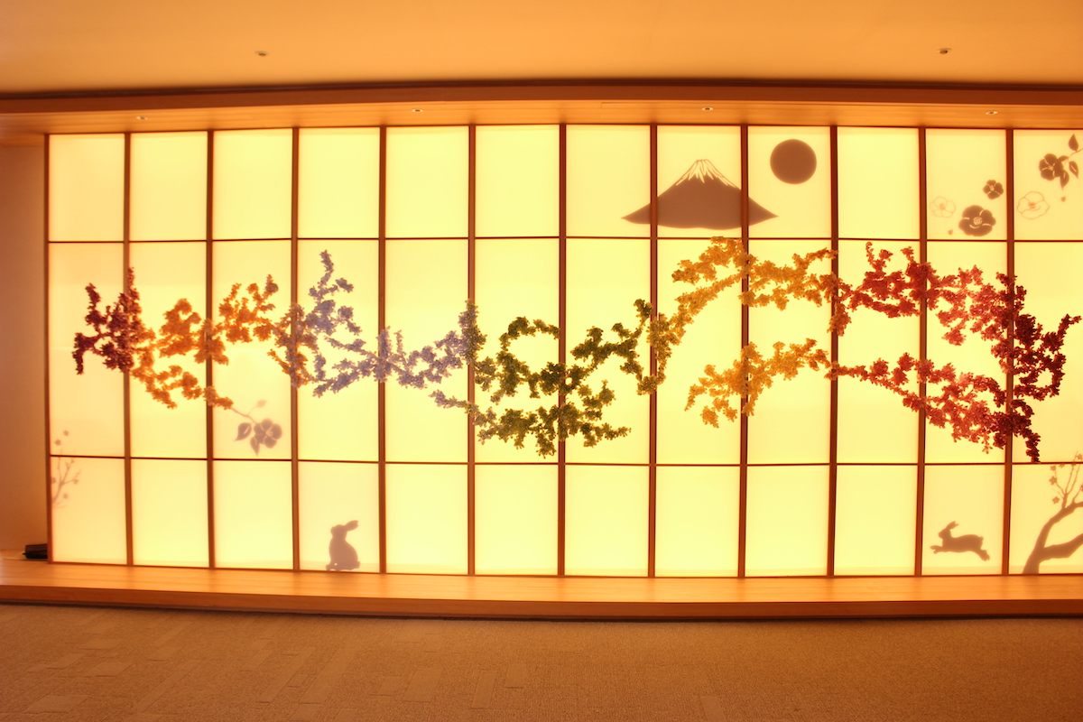 また、ロビー入口でぜひ注目してほしいのが、こちらの影絵。切り絵作家・水口ちはる氏の温かい切り絵の壁に、花和紙が飾られています。こちらも季節ごとに切り絵部分が変わるとのことで、季節の移り変わりをここでも感じられます。