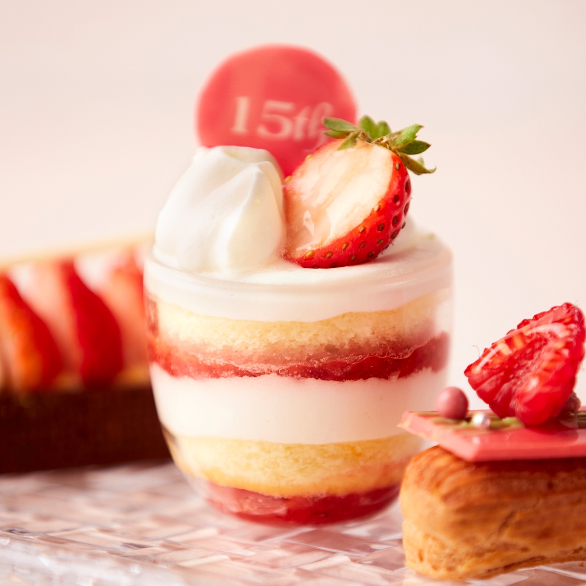 芳醇な味わいの「村田さん家のいちご」を使用した「15(いち・ご)グラスショートケーキ」。しっとり焼き上げたはちみつ入りのスポンジに、コクのある北海道産のフレッシュクリームと、イチゴのおいしさをぎゅっと凝縮したイチゴのコンフィを重ね、グラス仕立てにアレンジしています。「カフェ」15周年を彩るのにふさわしい、定番ながらも上質な味わいを堪能できるシェフ自慢の逸品です。