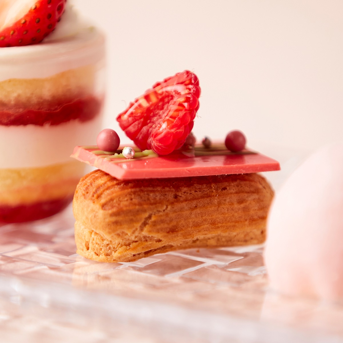 やわらかいシュー生地に詰めたコク深いカスタードクリームと、甘酸っぱいラズベリージャムの味わいがマッチした「ベリーエクレア」。トップにパリッと食感が楽しいチョコプレートと甘酸っぱいラズベリーをトッピングすることで、ワンランク上の味わいとなっています。