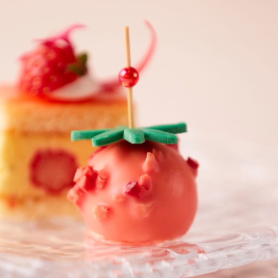 パリッとはじけるチョコレートの食感が楽しめる「いちごのロリポップ」。食べた瞬間にとろけ出すピスタチオクリームの中に、ほのかにローズが香るストロベリージュレを忍ばせた、シェフが工夫を凝らした一品です。