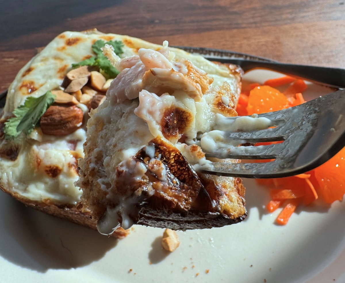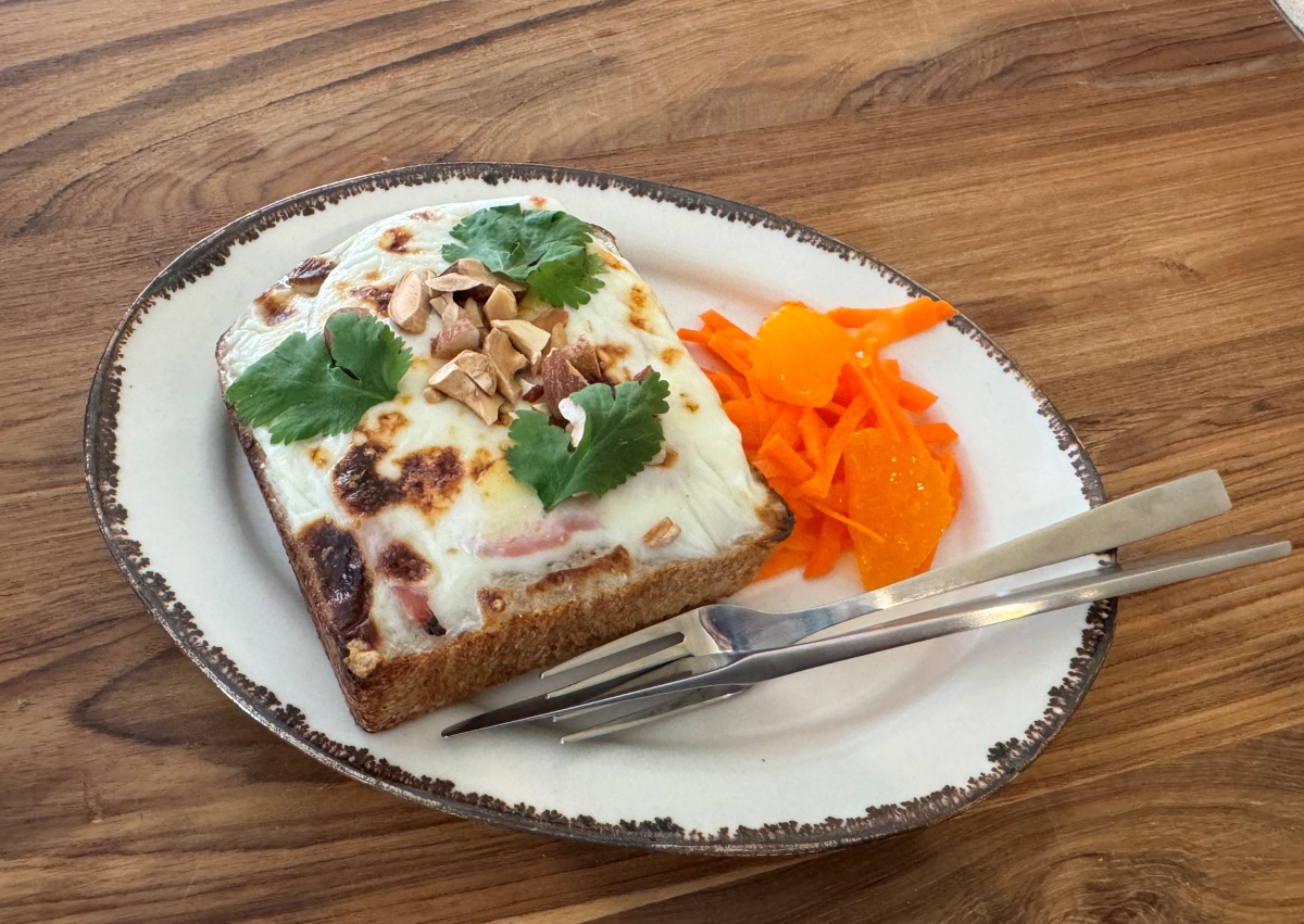 イートイン限定の「本日のオープンサンド」800円もいただきました。今日のメニューは、ミカン入りのキャロットラペが添えられた「クロックムッシュ」。