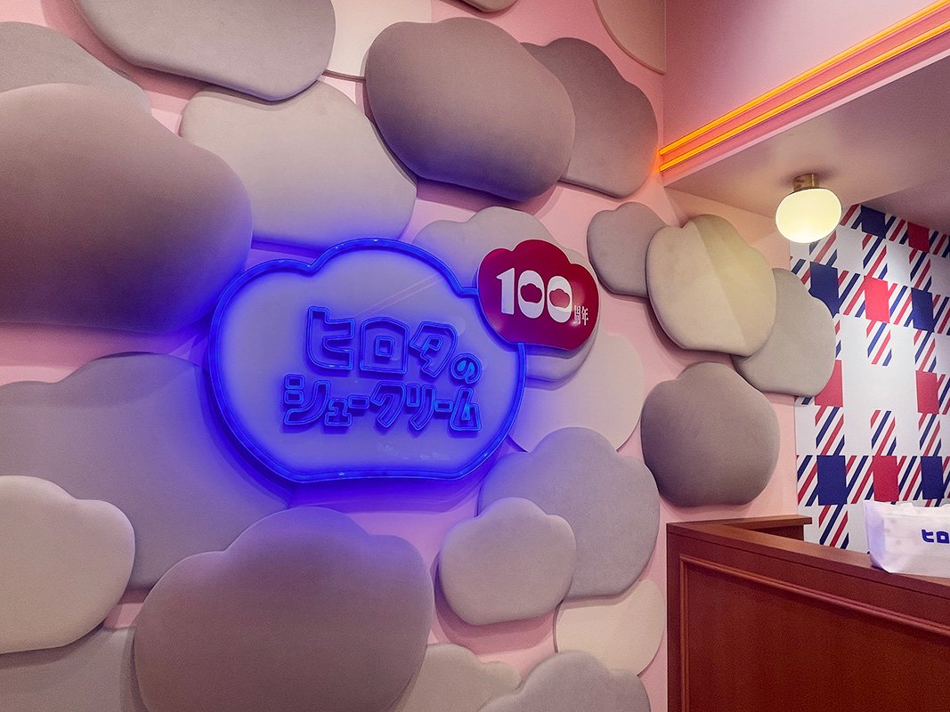 店内に入りまず目を引くのは、シュークリームをモチーフにしたというこの壁。ネオン看板でレトロな雰囲気を出しつつ、立体感のあるシュークリームが散りばめられていて、ポップでかわいいデザインになっています。