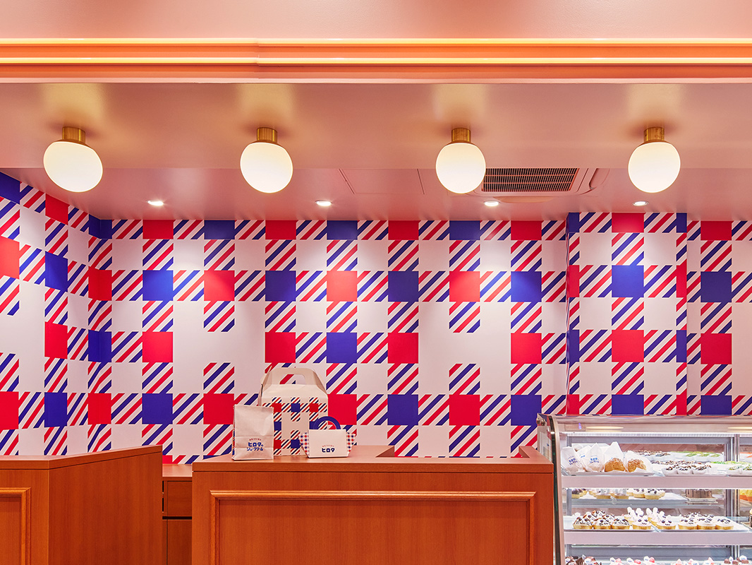 ヒロタブルーと赤を組み合わせたチェック柄がレジ奥の壁一面に広がります。