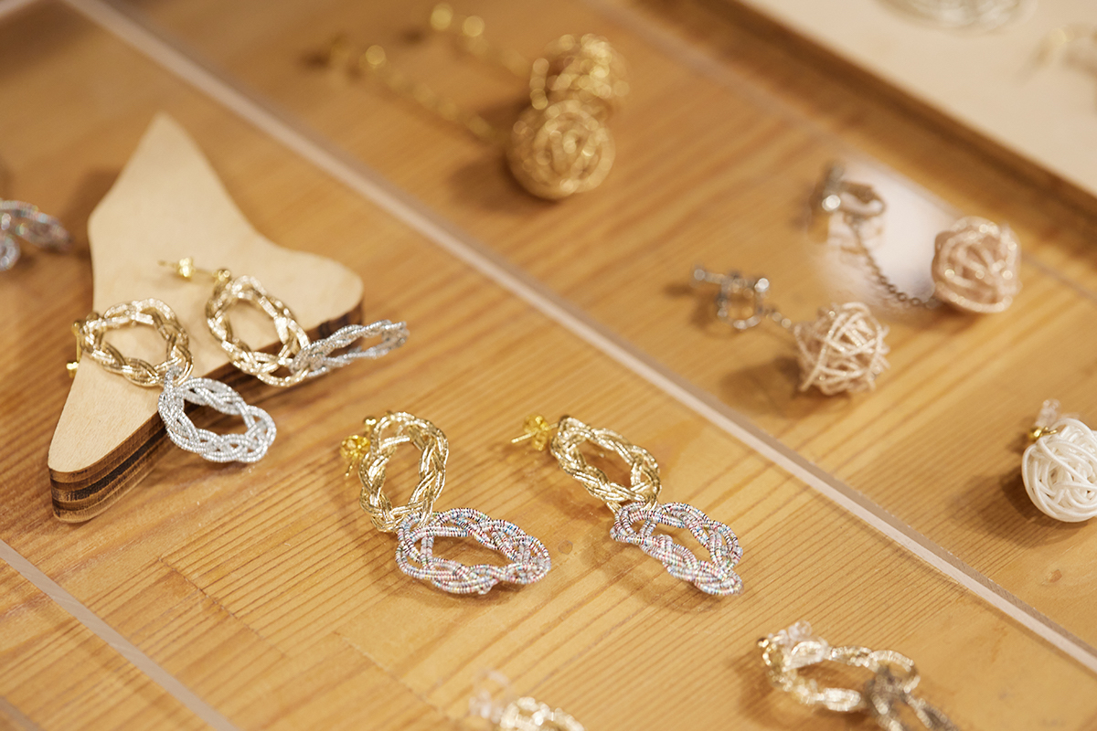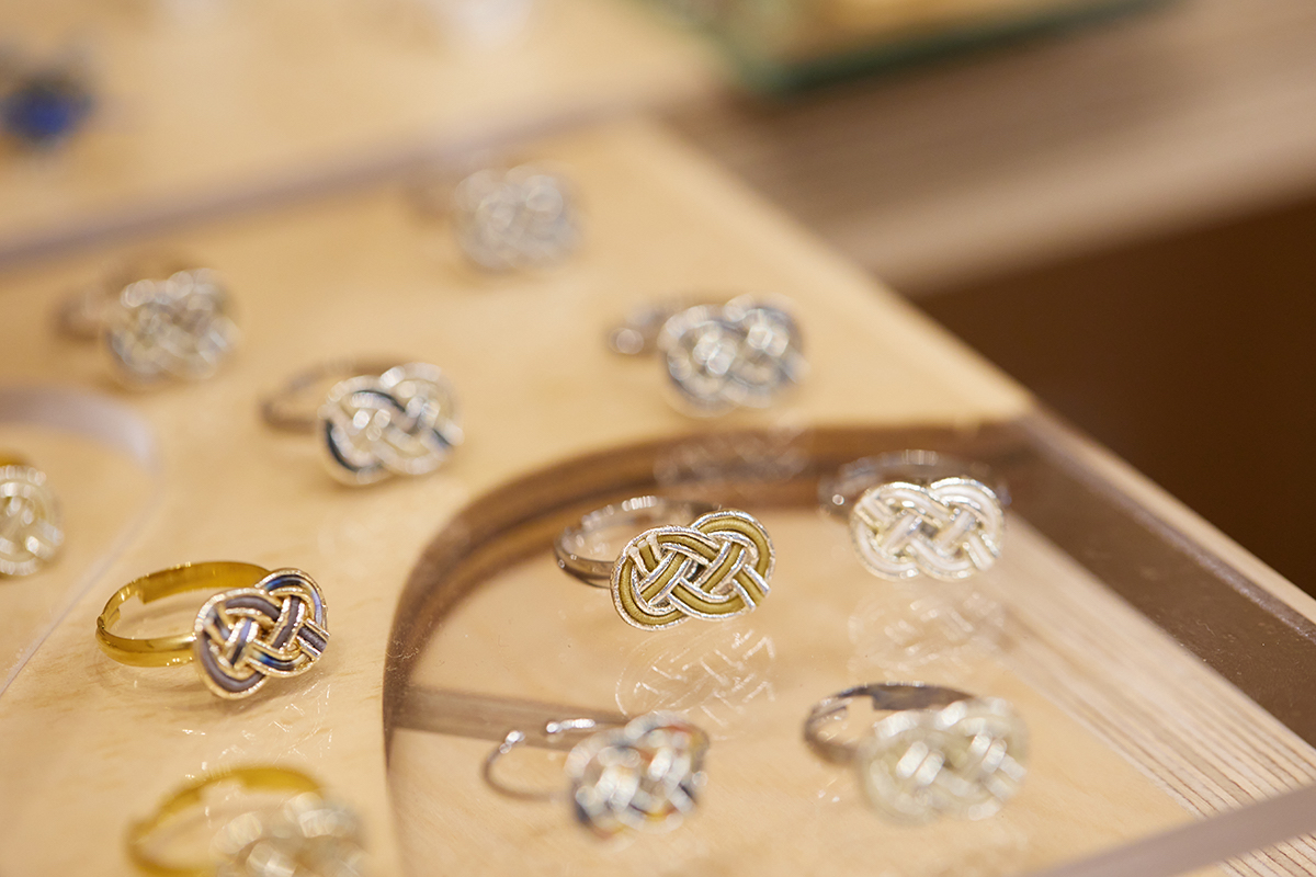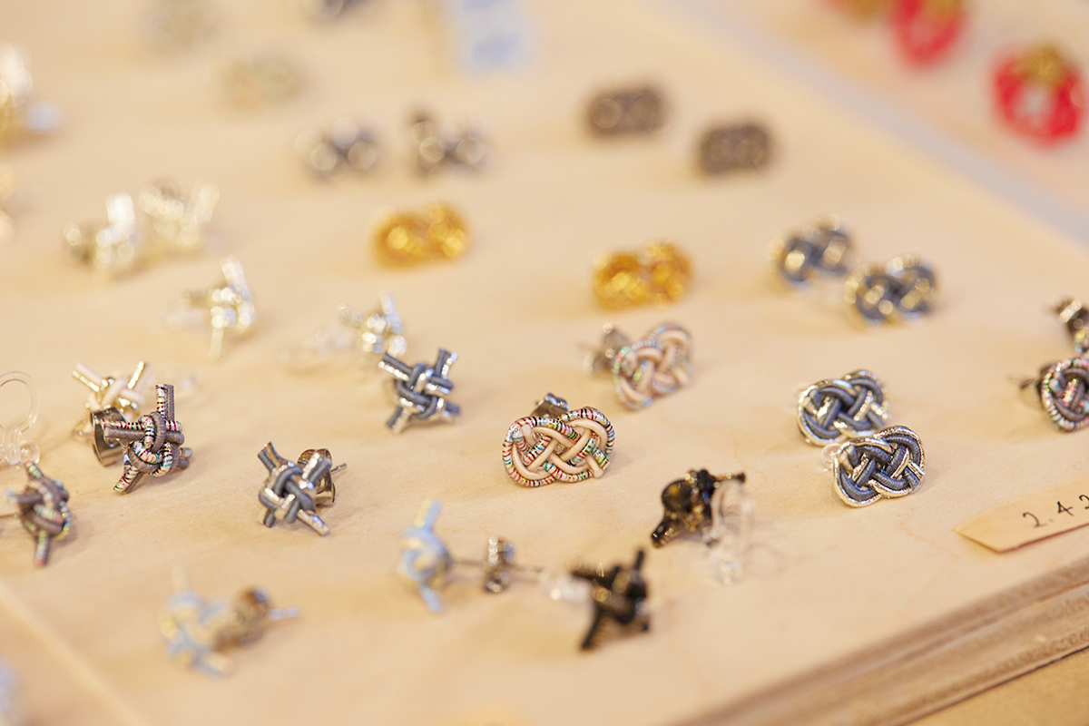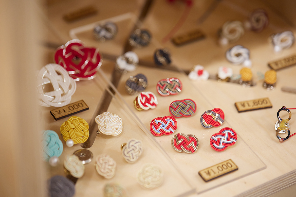 ワークショップを終えた後は、ギャラリーでショッピングして帰るという人がほとんどだそう。自分で水引を編む経験をした後にもう一度作品を見ると、少し見え方が変わってくるから不思議です。アクセサリーは、ピアスやイヤリングだけでなく、リングもあります。水引の伝統的な結び方が使われているものの今のファッションにもなじみやすいデザインで、日常使いができるものばかり。今回のワークショップではあわじ結びと葉っぱ結びでしたが、ほかにもいろいろな結び方があるので、ぜひ学んでみたいですね。