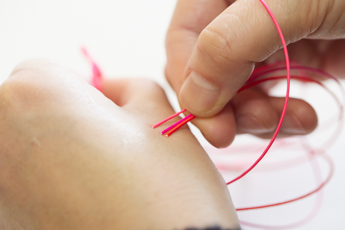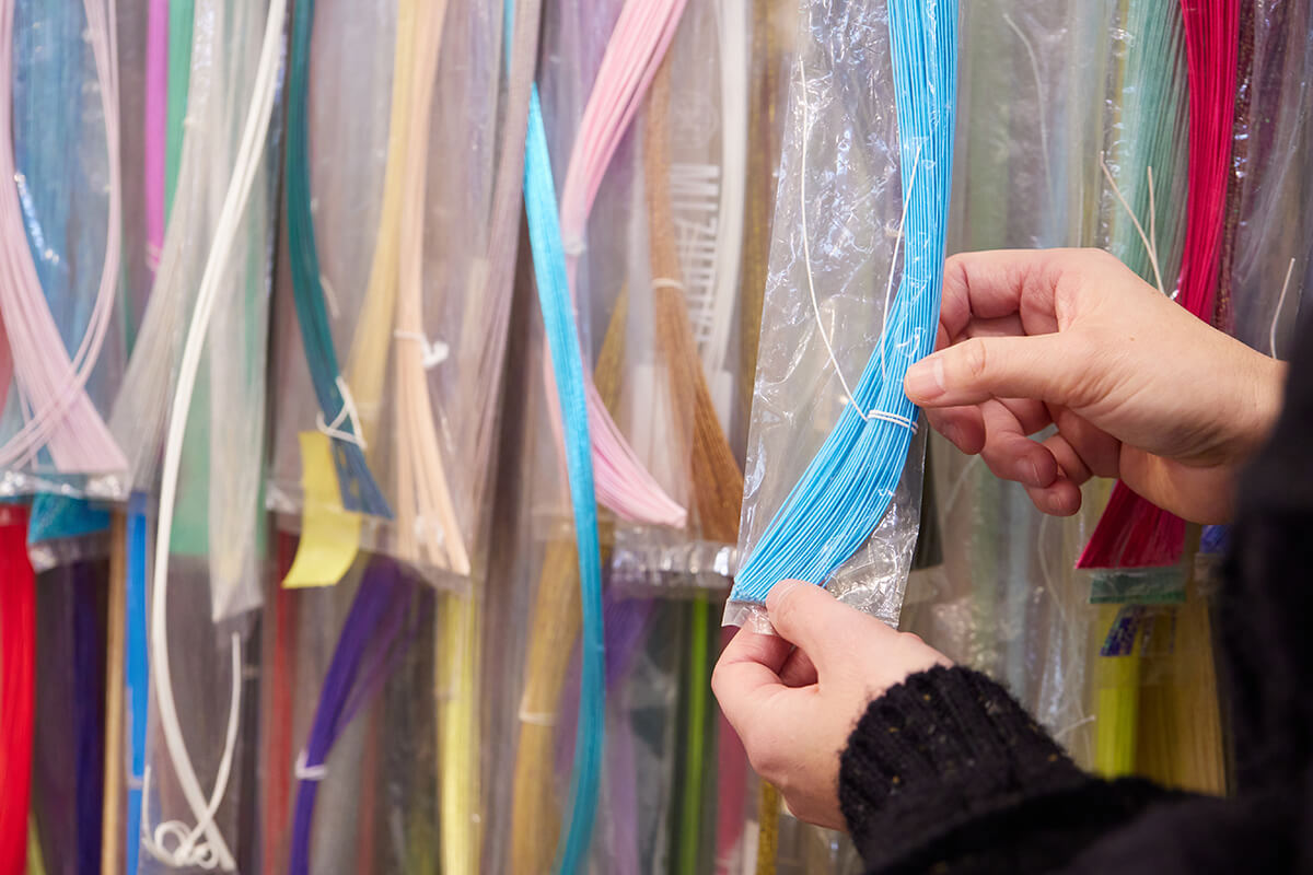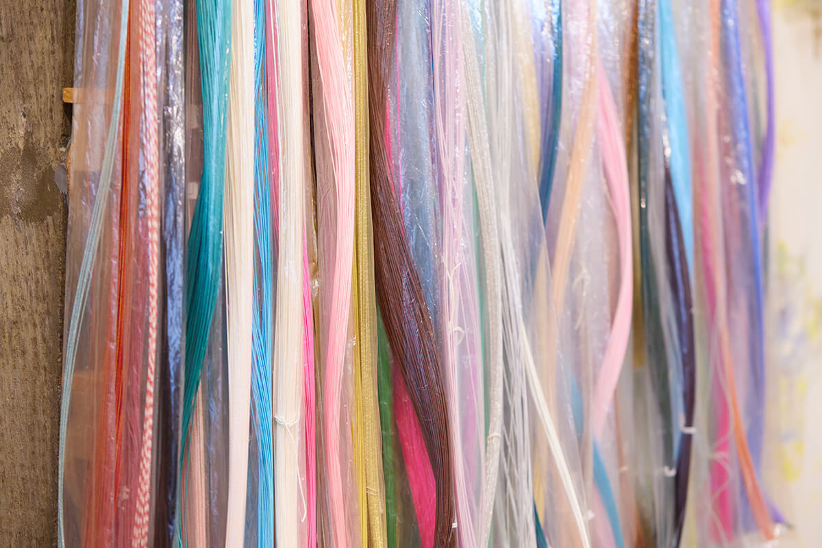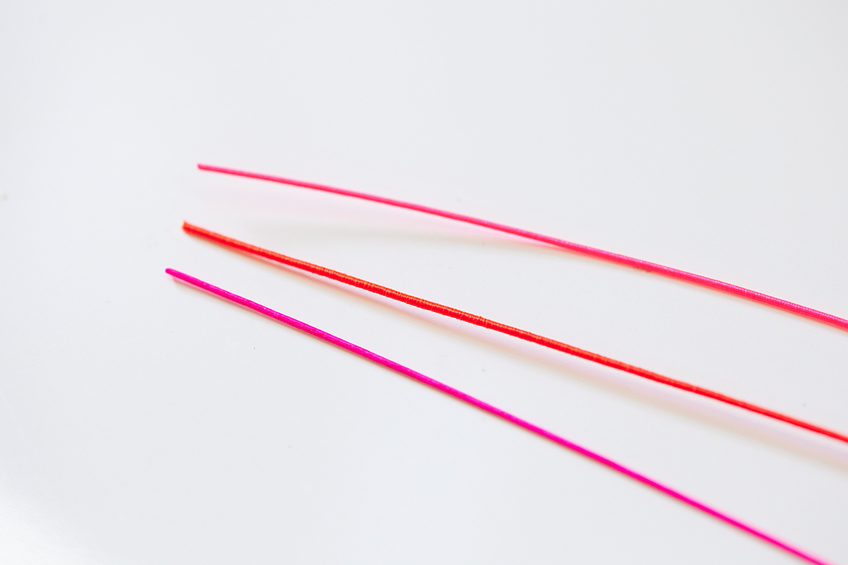 今回選んだのは、こちらのピンク系の色3本。ギャラリーに入った瞬間に、ネオンピンクで編まれた水引の作品に目を惹かれたというのが、これらの色を選んだ理由です。よく見ると分かるように、色によって素材や細さも異なります。