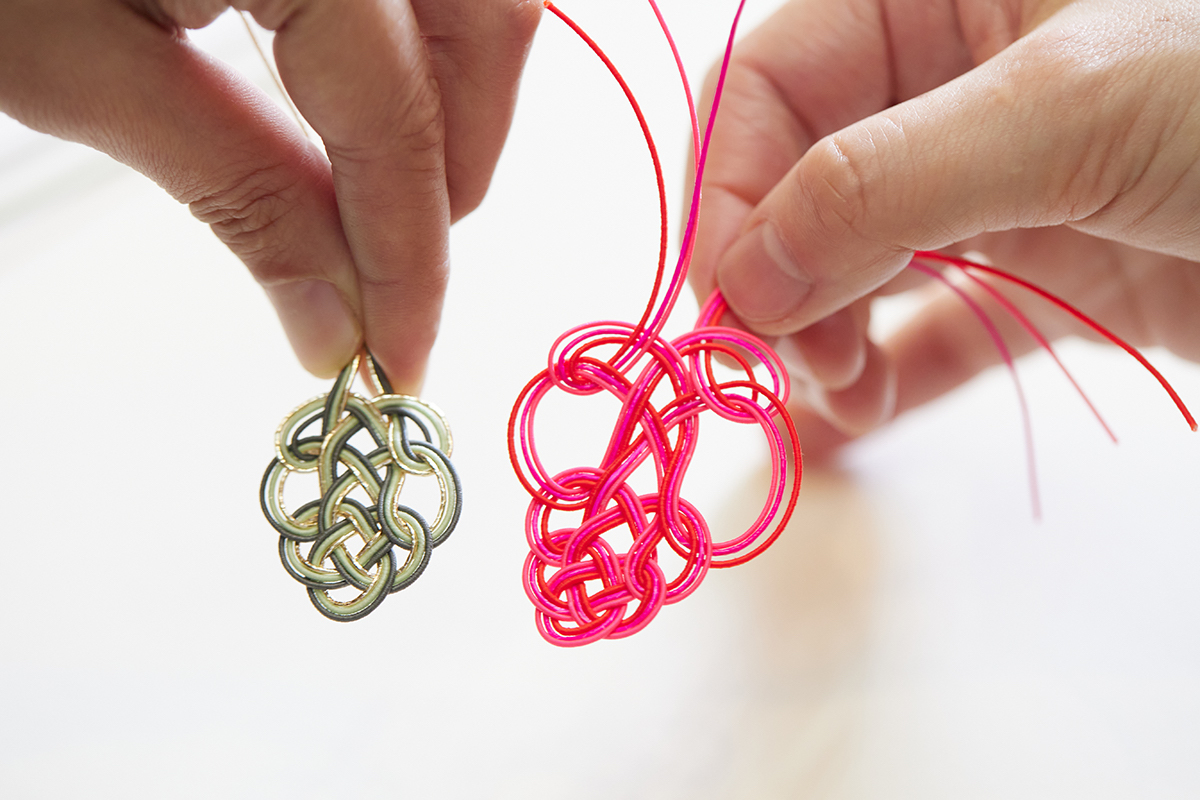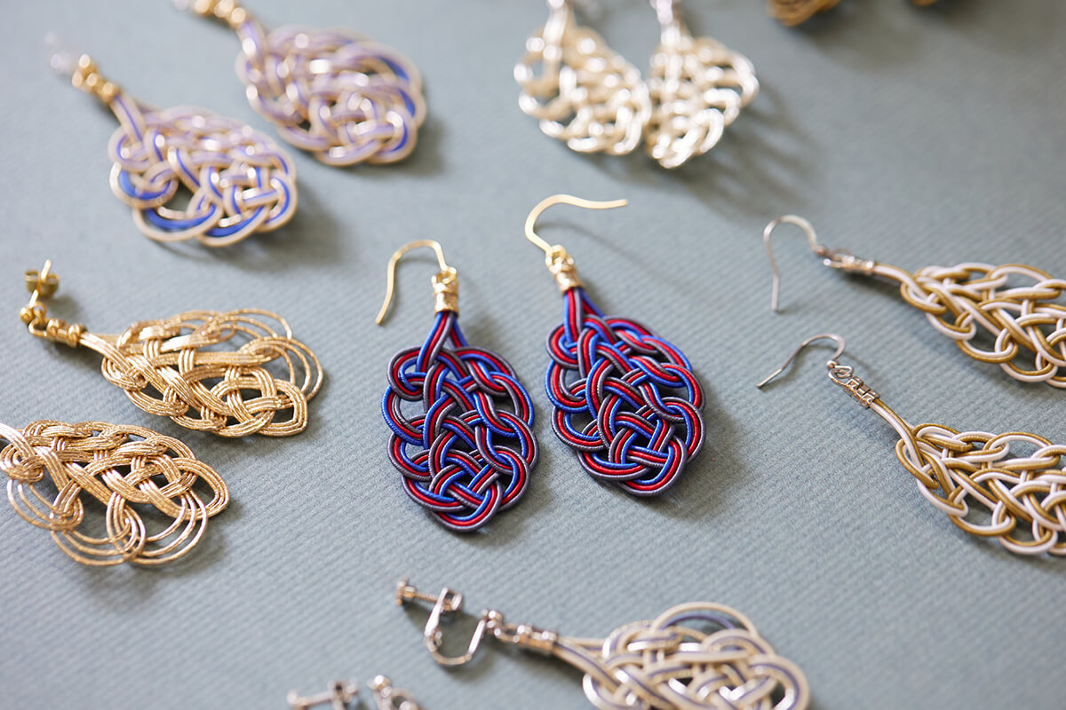 アクセサリーという小さな世界観のなかで繊細に表現される水引の美しさに、しばし見入ってしまいます。いろいろな結び方があって一つとして同じものはなく、これがあの細い水引1本から作られているなんて、信じられません。