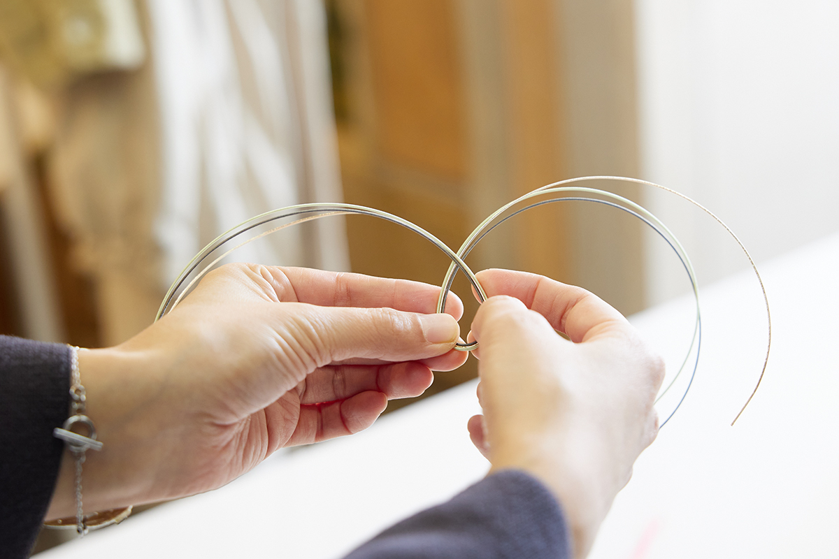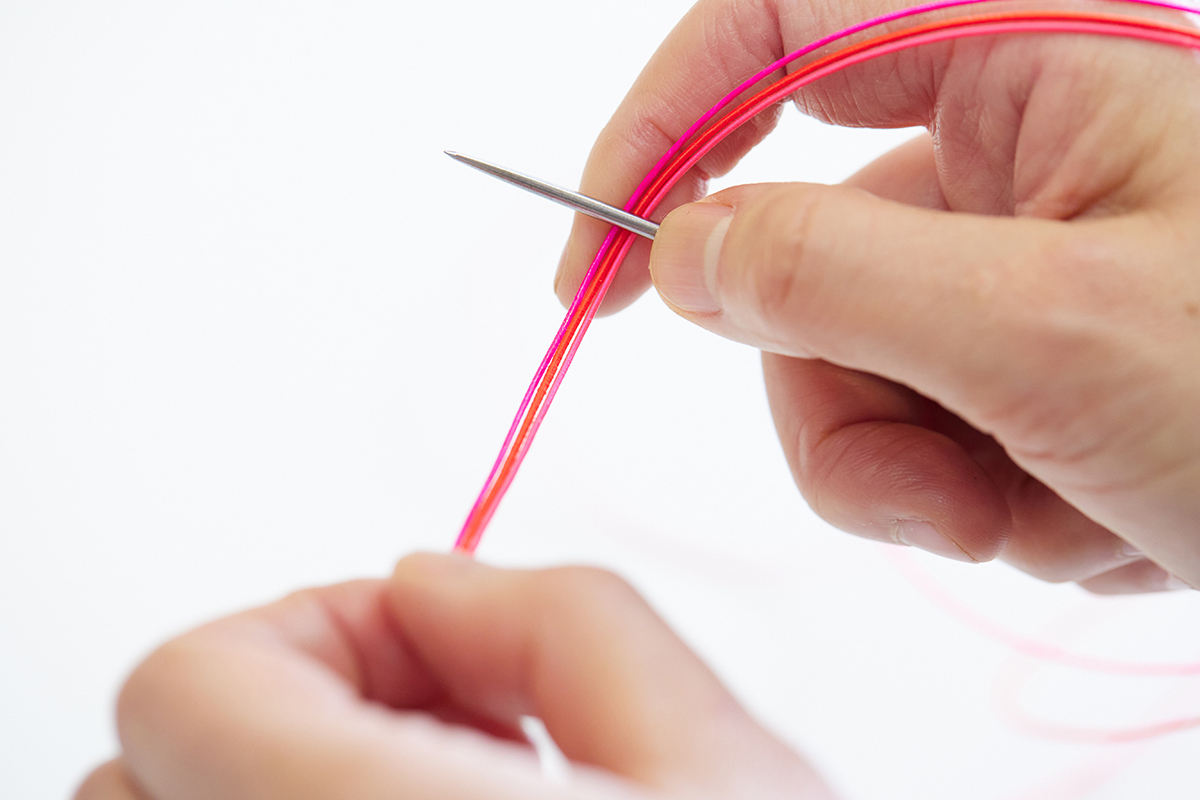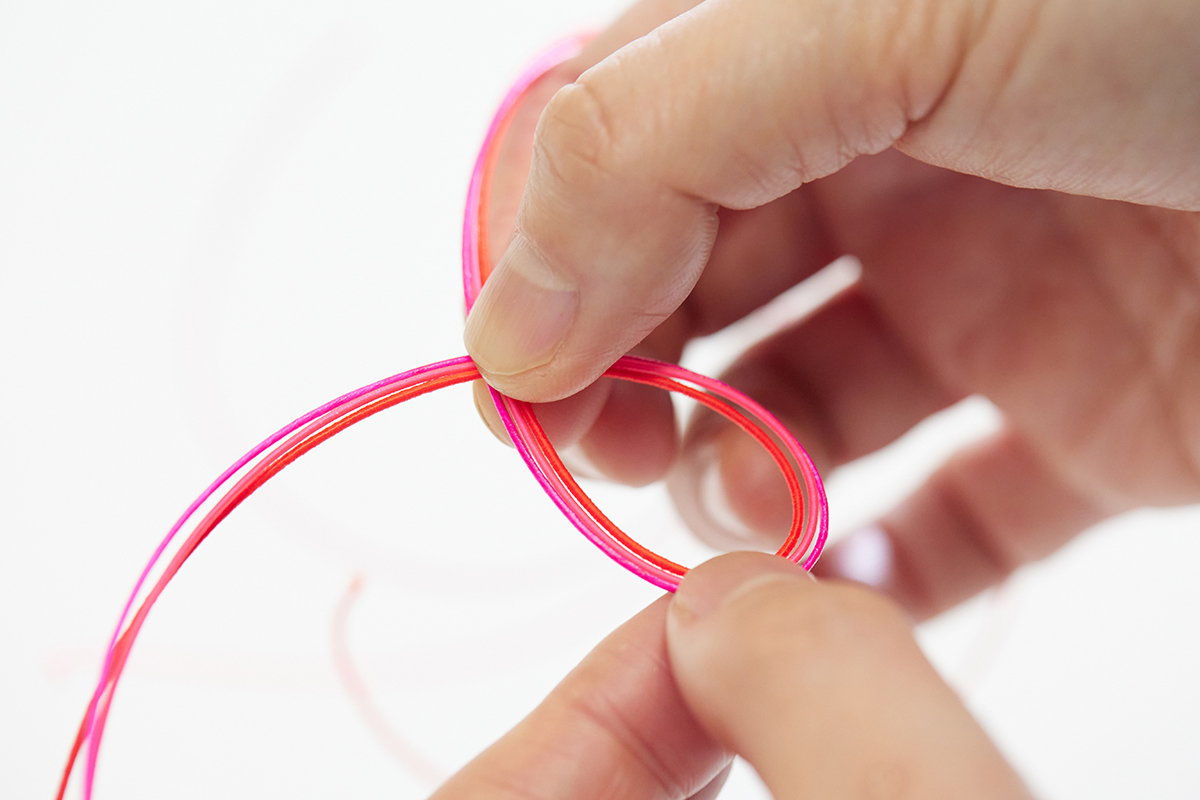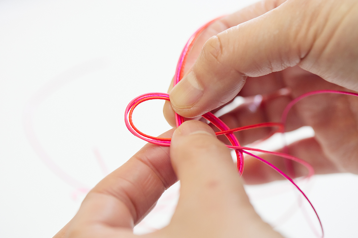 色順を決めたら、目打ちやペンの背中で水引をしごいていきます。水引がピンとまっすぐに張った状態だと、キレイな曲線で結んでいくことができません。今回は「あわじ結び」でピアスの形を作っていくため、この作業が結構大事なのだとか。直線を表現する仕上がりにしたい場合は、この作業を割愛することもあるそうです。「自宅で行う際など道具がない場合は、指でやっていただいても大丈夫ですよ」と、中村さん。