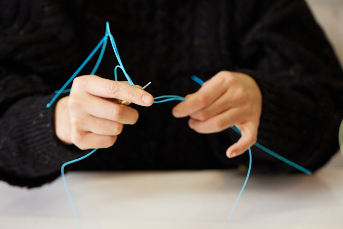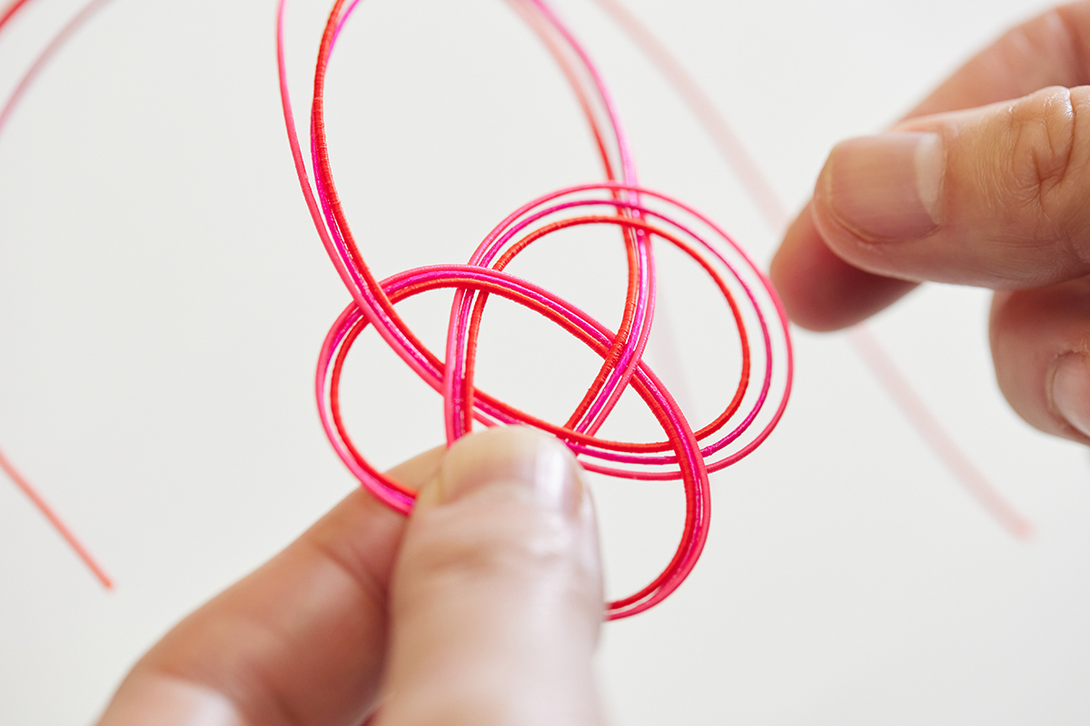 結ぶときに結び目の形を、都度好きな大きさに調整しつつ、全体を形作っていきましょう。結び目の空洞の大きさだけで印象が変わるのがおもしろく、つい夢中になってしまいます。