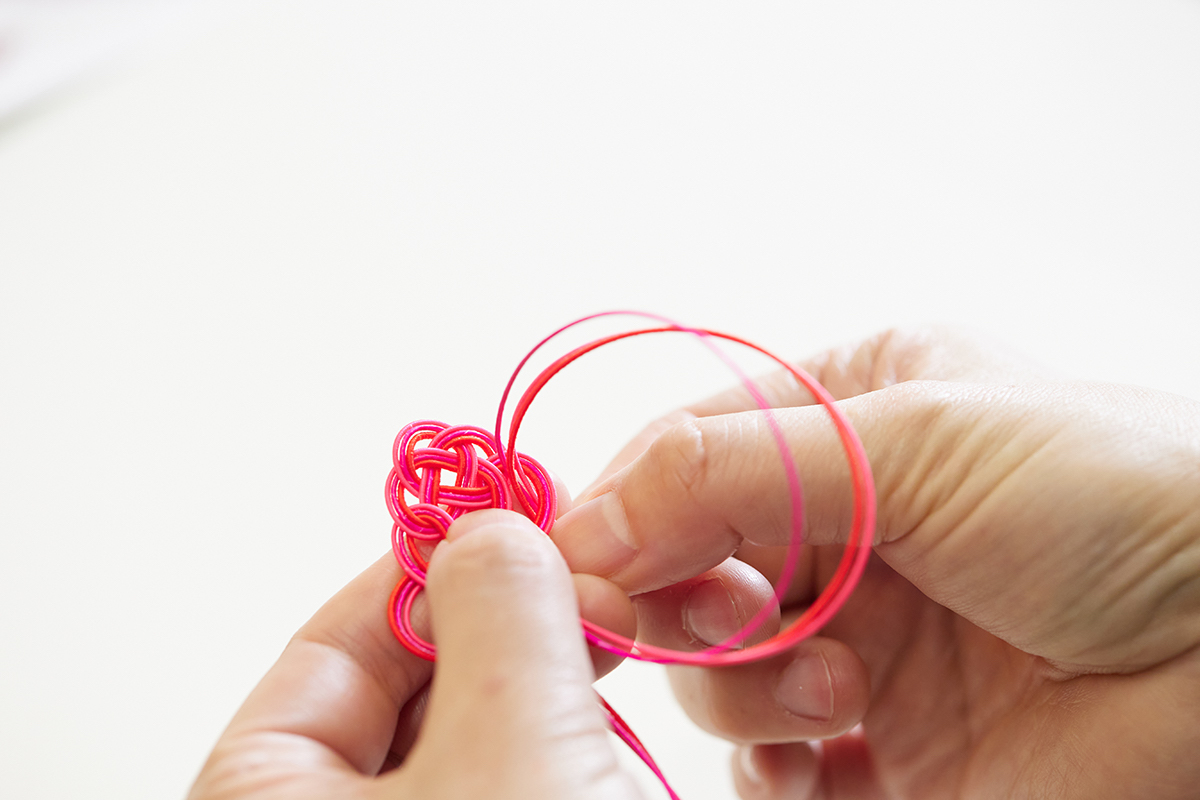 こうして一つあわじ結びができたら、あとは繰り返しの作業が続きます。水引の色順に気をつけながら、丁寧に行っていきましょう。結び目の空洞の大きさでも仕上がりイメージが変わるので、どんなふうにするかを思い浮かべながら結んでいきます。