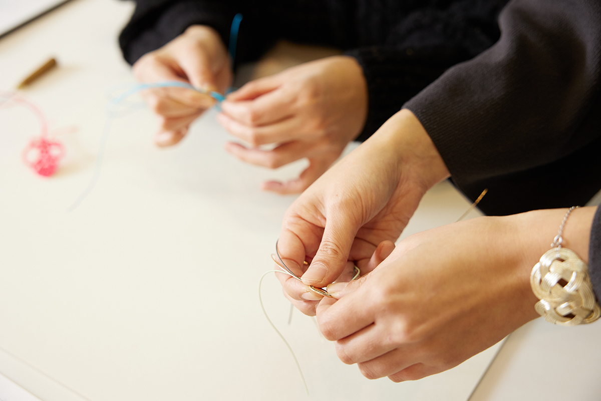 通し方が合ってるかどうか、その都度確認をしてもらいながら進められるので安心を。「内側のこの色から引っ張りましょう」などと、丁寧にアドバイスをしてもらえますよ。結び目をいくつ重ねるかは、好みでOK。仕上がりを大きくしたいかコンパクトにしたいかなどのデザインイメージを伝えつつ、アドバイスをもらいながら進めましょう。
