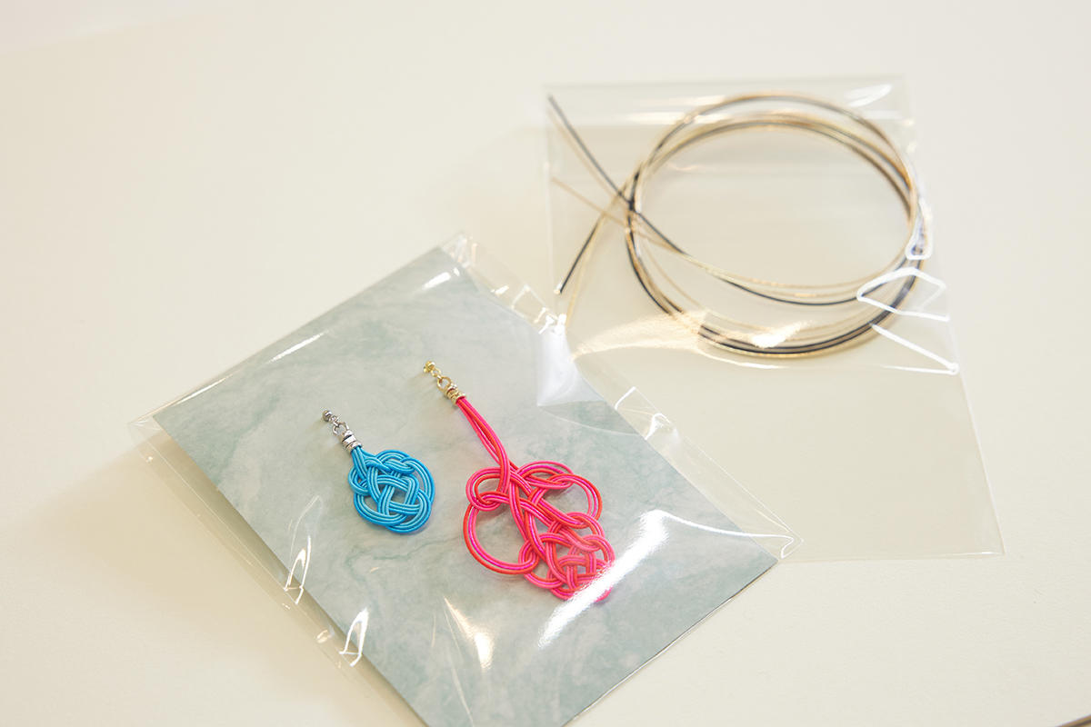 完成したピアスは、選んだ台紙にのせた状態でラッピングして持ち帰ることができます。さらに、自宅でも今回教わったピアス作りに挑戦することができるようにと、水引のおみやげも持たせてくれました。こちらも、好きな色の水引を選ぶことができます。