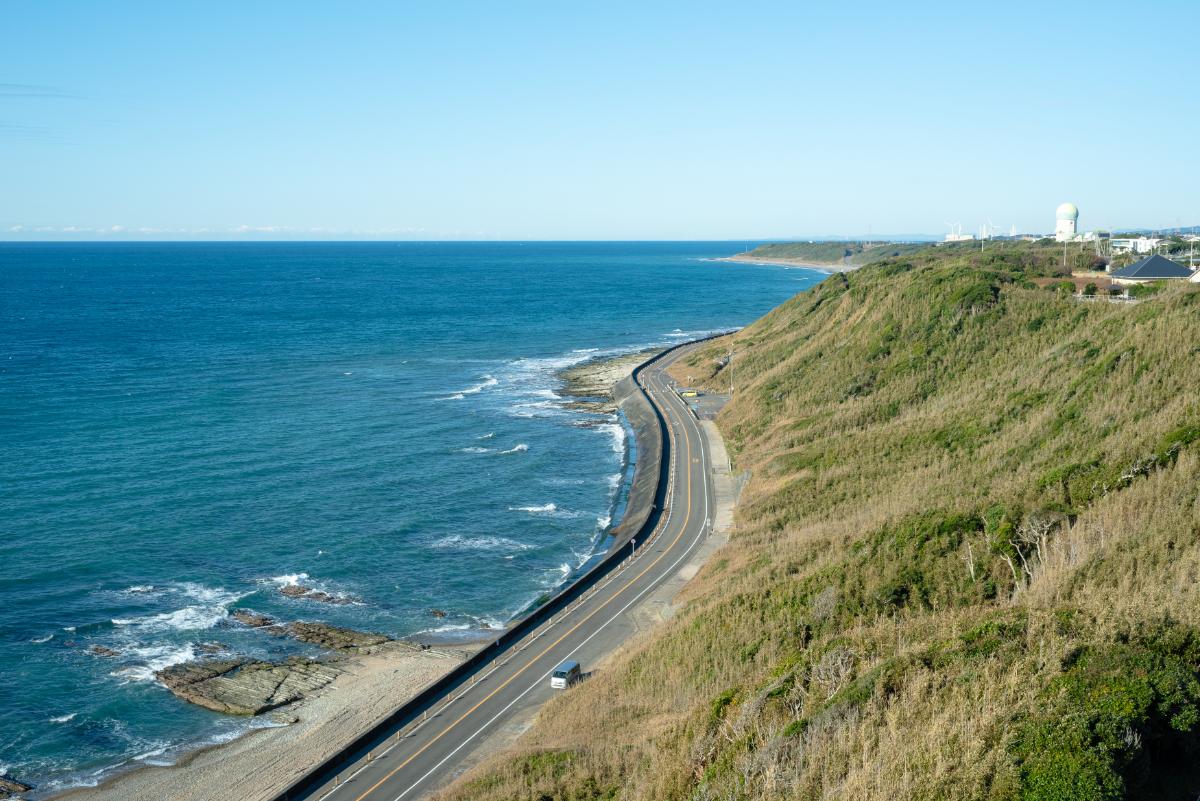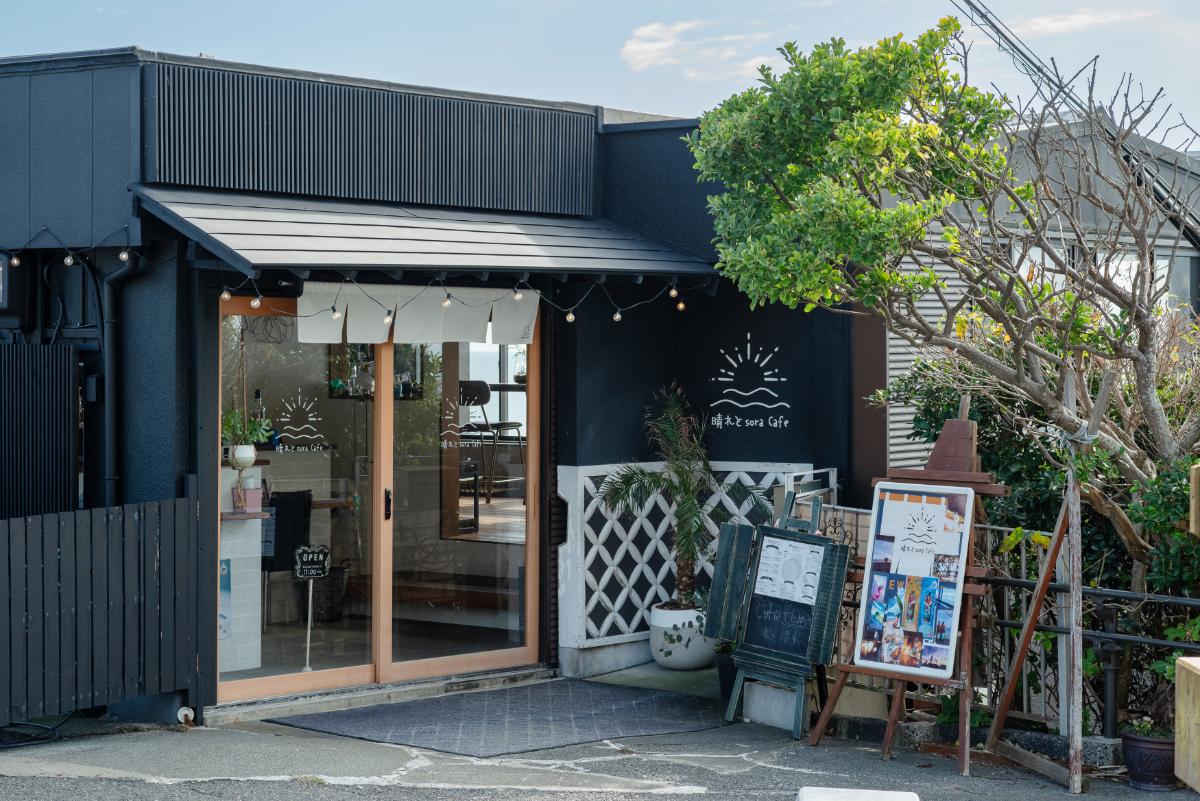 御前崎市にある「晴れとsoraCafe」は、静岡県最南端の海岸沿いに位置しています。黒い外観になまこ壁が目を引く、崖の上にある建物が目的地。心地よい潮風を浴びながら、爽快なクルマ旅を楽しみましょう。