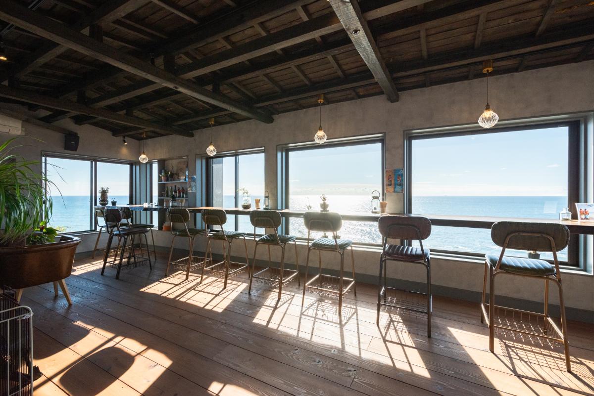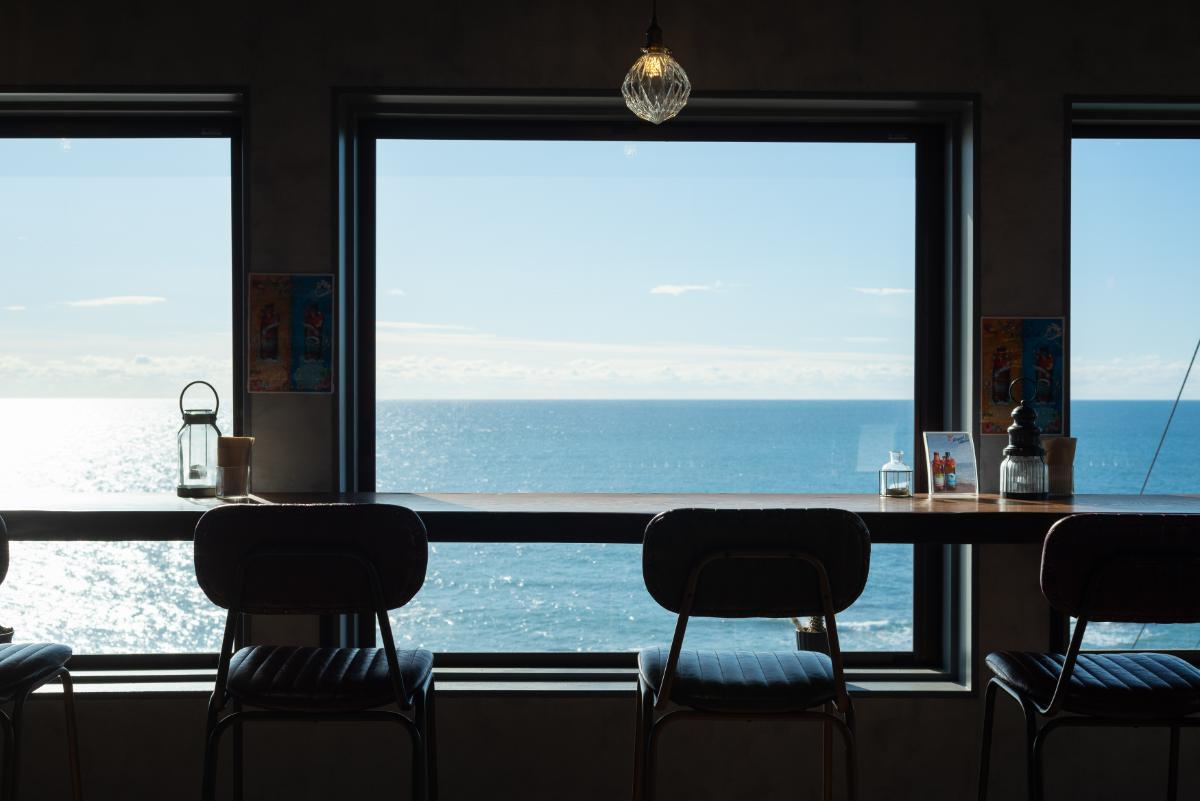 絵画のようなカウンター席。海を見ながらカフェタイム
