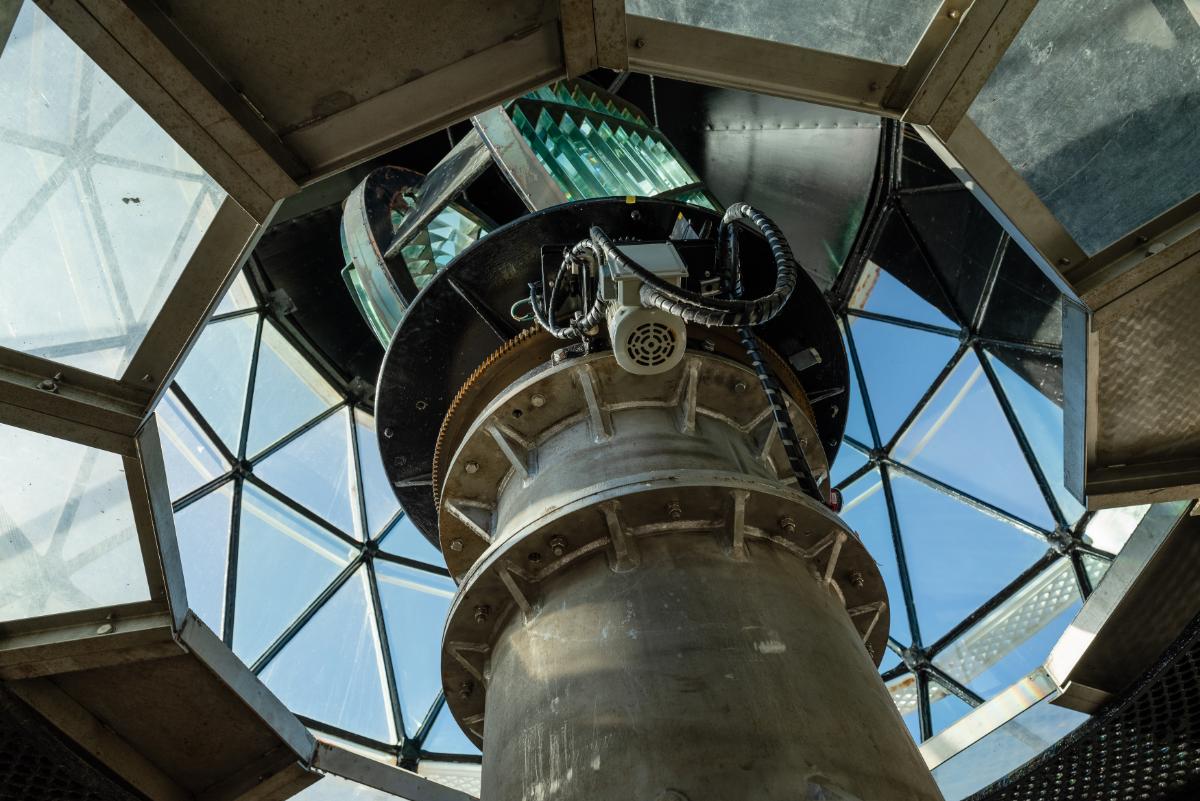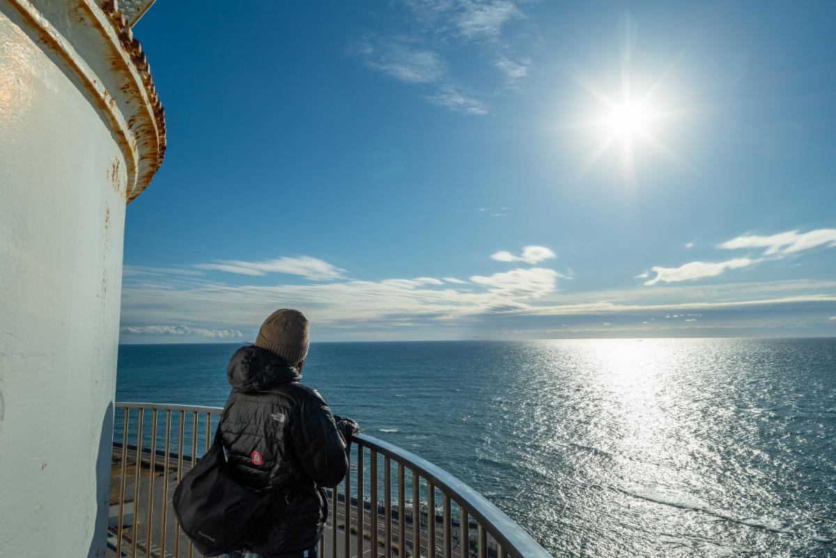 灯台の中に入り、70段の螺旋階段を上がっていくと、踊り場に到着。晴れた日には、伊豆半島や富士山も見渡せる絶景が待っています。