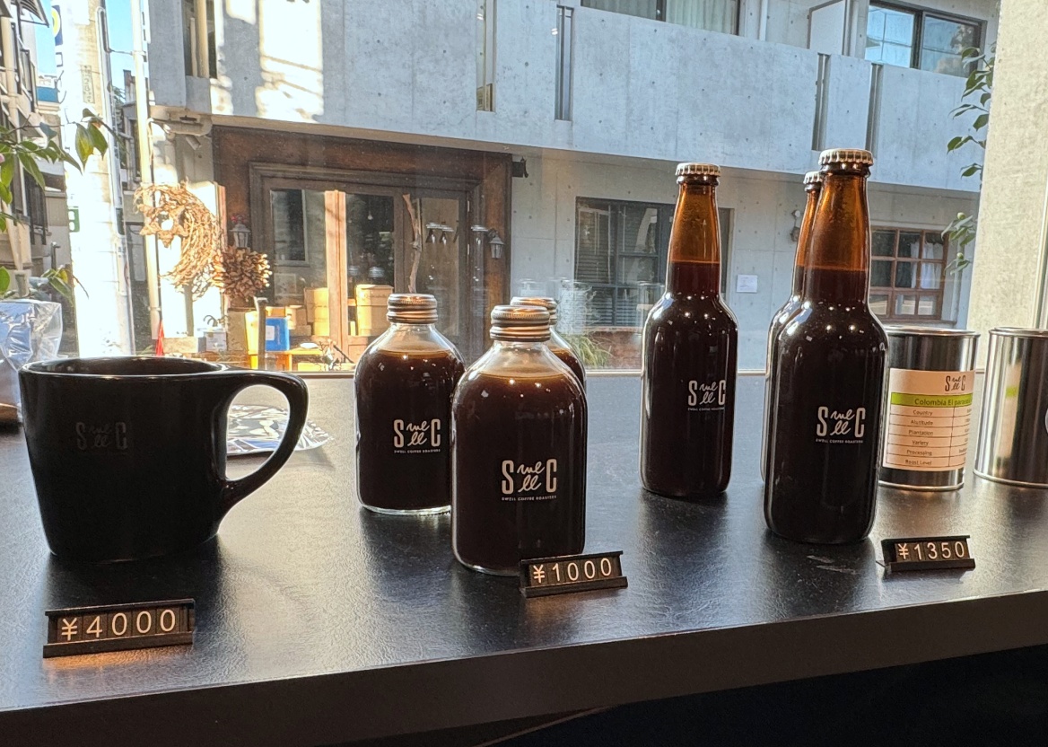 店内では缶入りの自家焙煎コーヒー豆や、瓶入りの「クラフトボトルコーヒー」1000円や「カフェラテベース」1350円、「オリジナルマグカップ」4000円なども購入することができます。