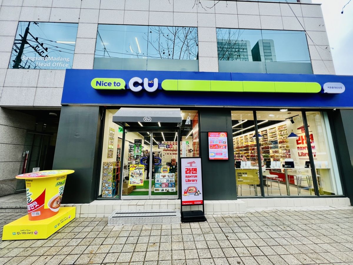 韓国のメディアもこぞって取材しに行くほど、今、新名所としてもっともホットなこちらのラーメンライブラリー。いったいどんなところなの?ということで、行ってきました!弘大エリアの地下鉄6号線上水駅から徒歩数分のところにあるコンビニエンスストアCUの前に行くと、大きな韓国のカップラーメンのオブジェがあり、一般的なコンビニとはちょっと違うのが分かります。実はここ、韓国では初のラーメンを200種類以上集めたラーメン専門店のコンビニなんです。