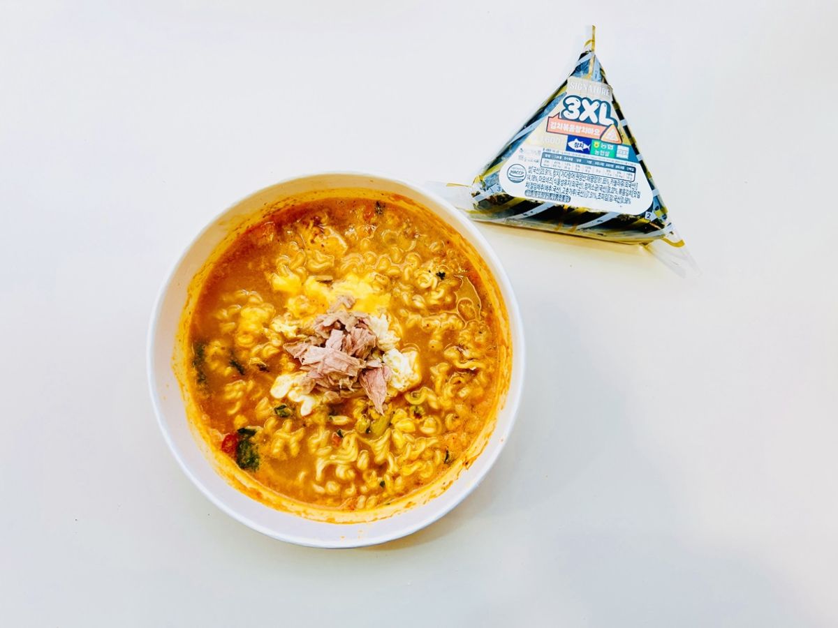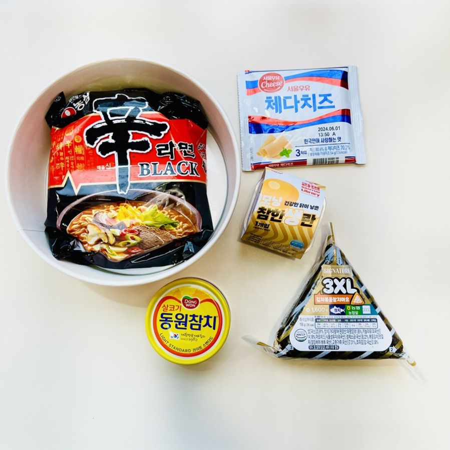 レシピに合わせて、コンビニ内で最初にお会計をします。ラーメンをイートインする場合には、容器代として900ウォンかかります。写真のような内容で、費用は総額9800ウォン。意外と高く驚きましたが、チーズやツナ缶、おにぎりに生卵も含まれます。